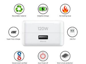 Kenviq 120W Type C Charger Compatible with realme NARZO N61 | Adapter with Data Cable | Fast Charging for Android Devices, USB Type A Port, Wall Chargers, Power Adopter, 1meter Red Cable