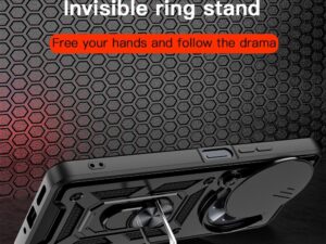 Designerz hub® Redmi A4 5G Back Cover | Heavy Duty Hybrid Case with 360 Degree Rotating Finger Ring Holder + Slider Shutter Camera Protection Case for Redmi A4 5G – Black