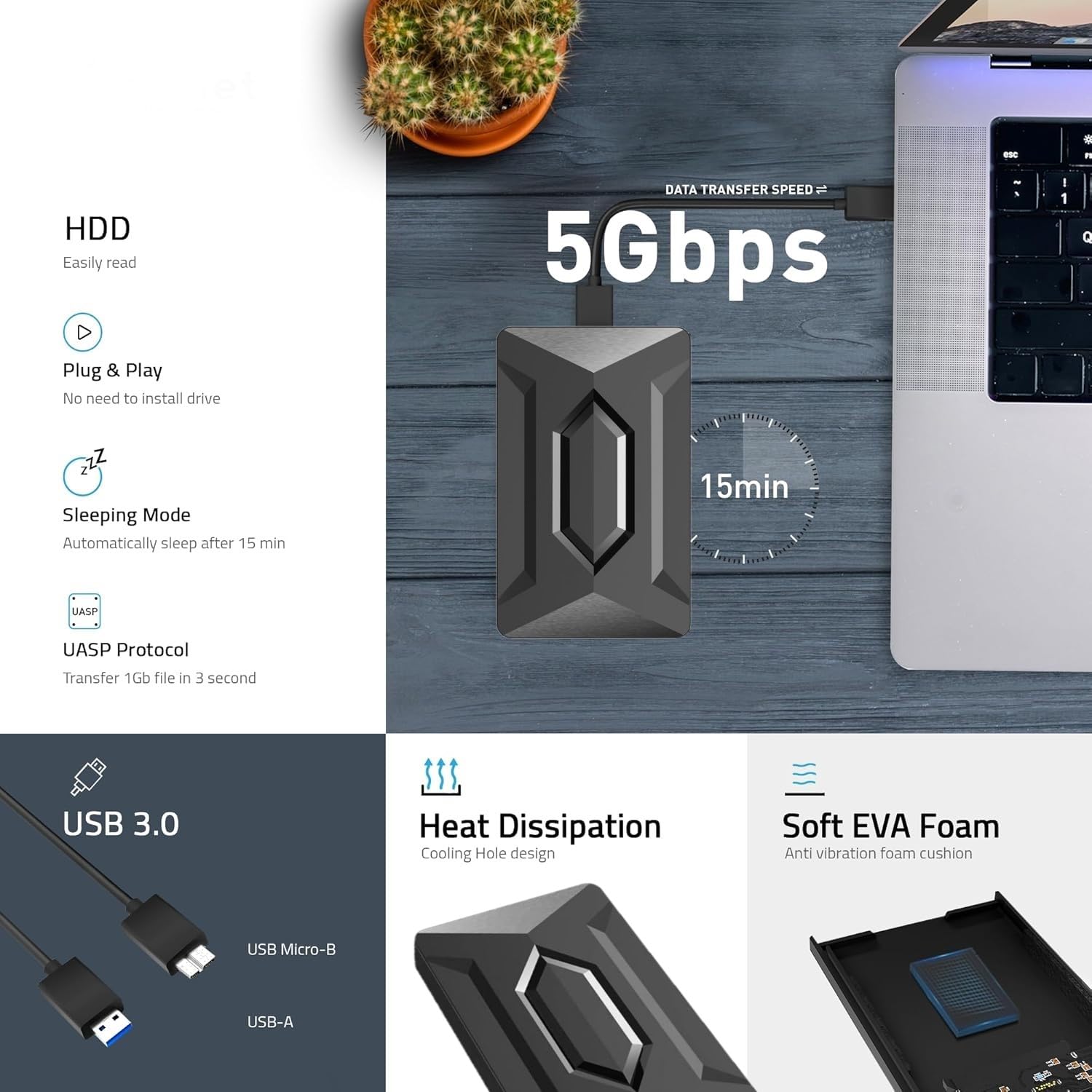 【Support UASP】- When the portable hard drive is connected to a host controller with UASP function, its data transmission speed is 70% faster than the traditional USB 3.0 standard, which can effectively increase your hard disk transfer rate. The external USB3.0 output interface can support a transmission rate of up to 5Gbps. This allows you to take full advantage of the potential of SATA I/II/III hard drives