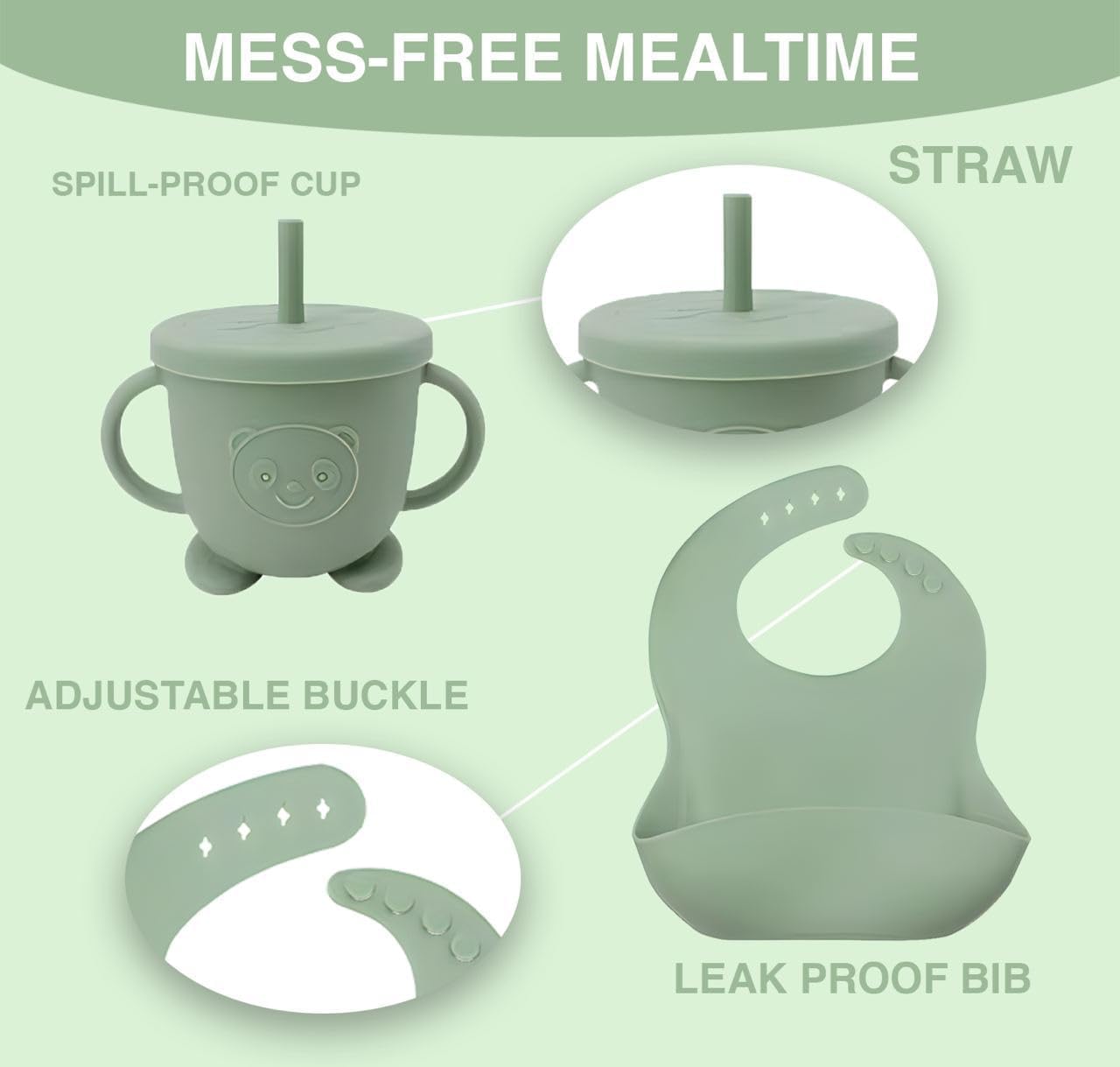 6-in-1 Feeding Set – Plate, bowl, cup with straw, bib, spoon & fork.
