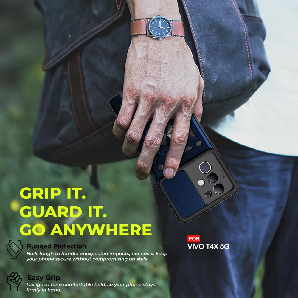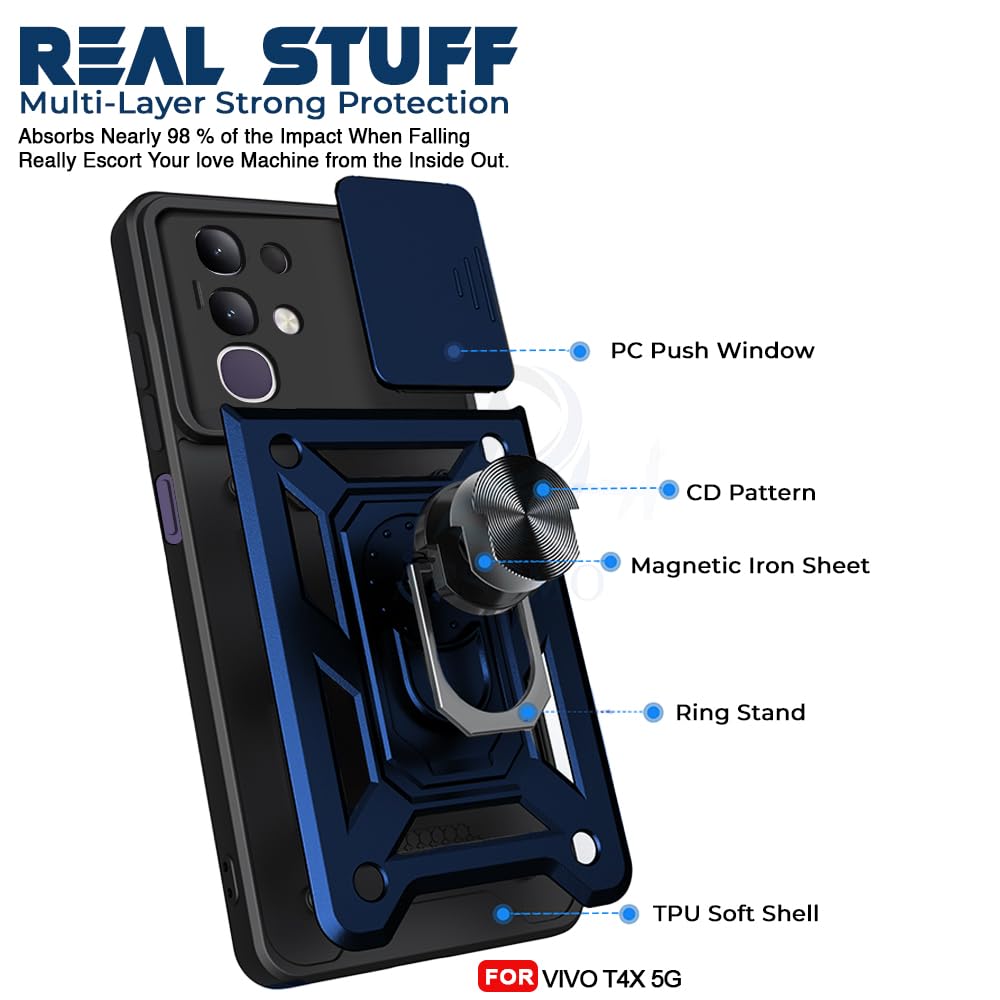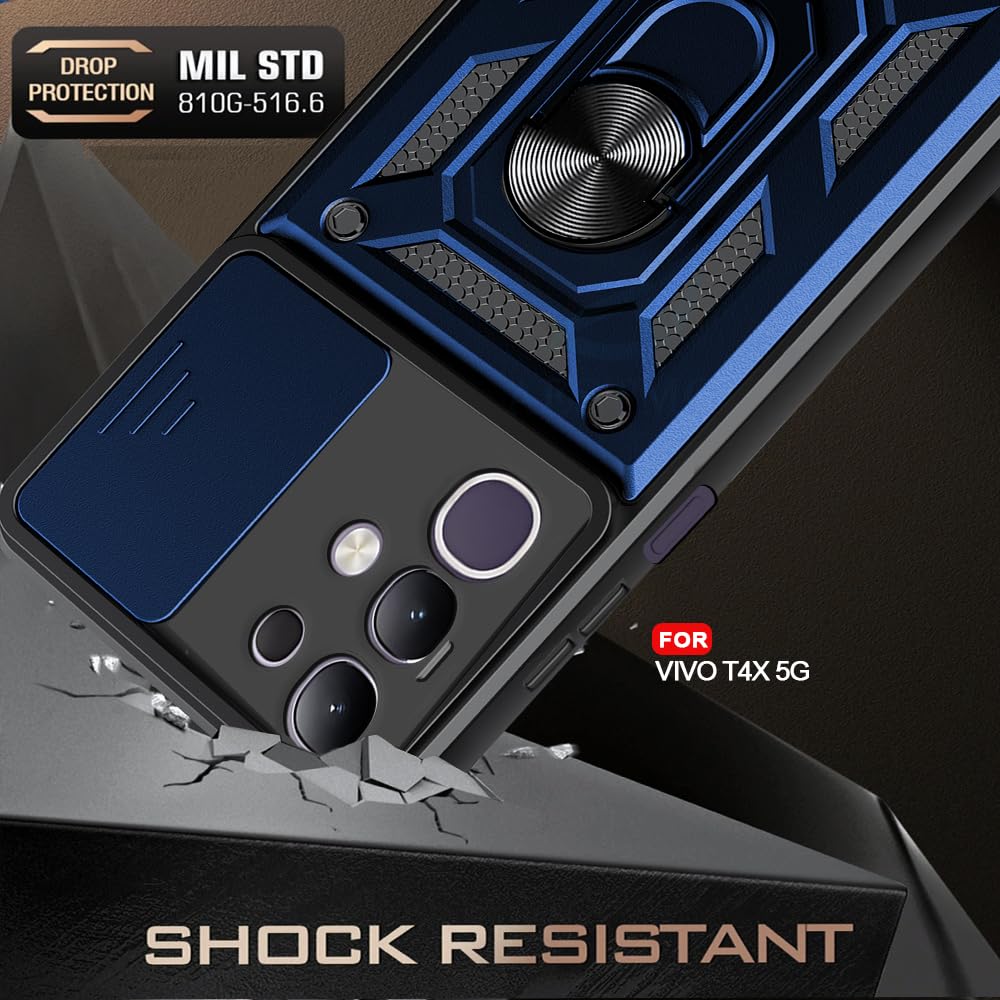 AESTMO Tough Armor Vivo T4X 5G / iQOO Z10X 5G Bumper Back Case Cover | Ring Holder & Sliding Camera Shield Cover | 360 Degree Protection Back Case Cover for Vivo T4X 5G / iQOO Z10X 5G (Blue)
