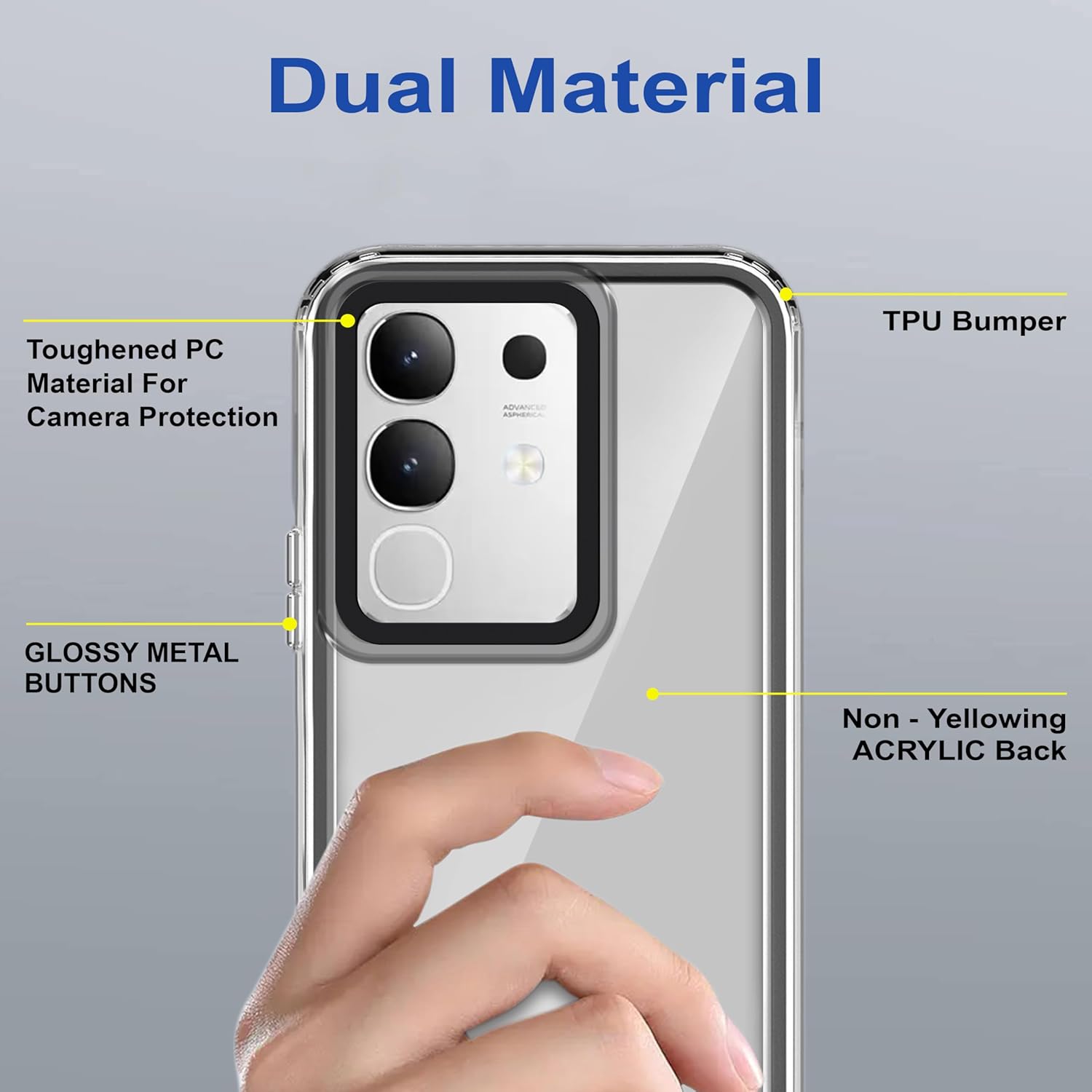 [Material] The Edge technology fusing made of Superior Quality TPU Material, Translucent back panel made from Imported Polycarbonate that does not get Yellow and gives a Premium Touch & feel.