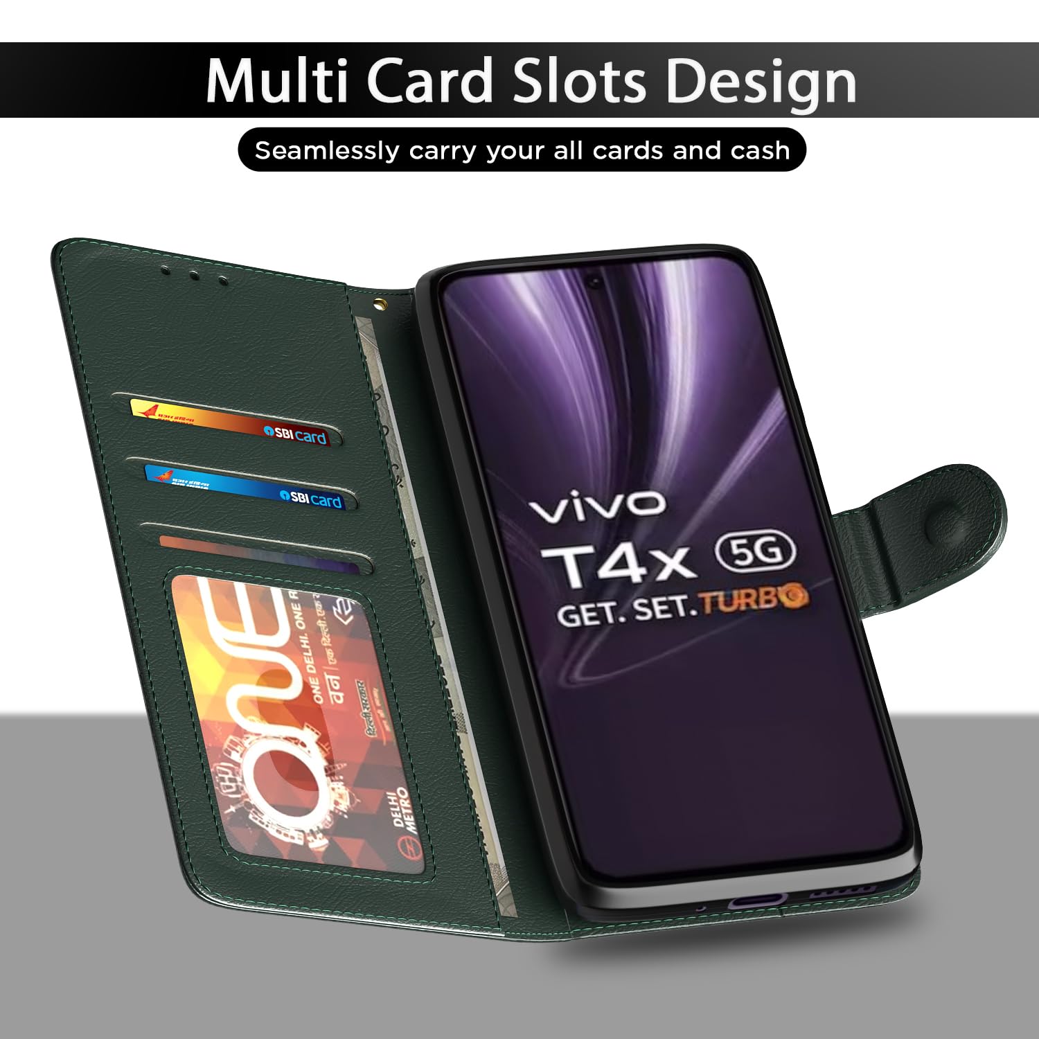 Amazon basics Flip Cover for Vivo T4x 5G / iQoo Z10x 5G Leather Finish | Wallet Stand and Shock Proof | Inside TPU with Card Pockets | Complete Protection Flip Case(Green)