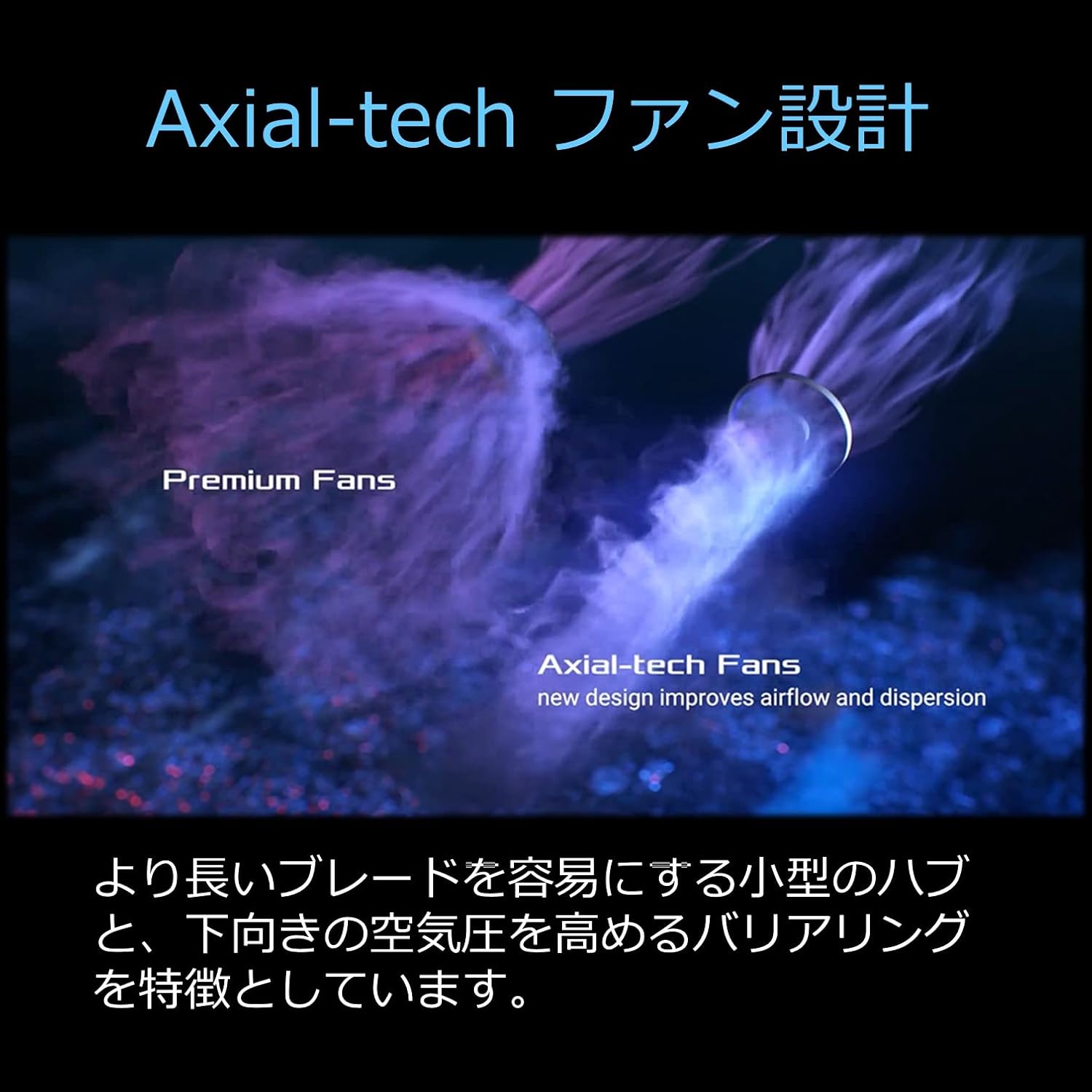 Axial-tech fan design features a smaller fan hub that facilitates longer blades and a barrier ring that increases downward air pressure.