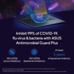 ASUS Antimicrobial Guard Plus is applied to frequently touched areas of your laptop to help keep it hygienic. This technology uses a denser treatment* that inhibits viruses and bacteria. And it is scientifically shown — using the ISO 2170211 and 2219612 standards — to inhibit virus and bacteria growth by more than 99% over a 24-hour period.