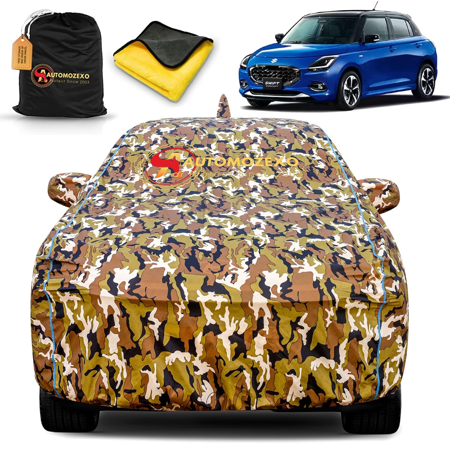 AUTOMOZEXO Maruti Swift 2024 100% Waterproof Car Cover for All Weather Protection with Mirror & Antena Pocket Inner Cotton Triple Stitched Adjustable Belt Bottom Elastic Cover to Secure Fit -Jungle
