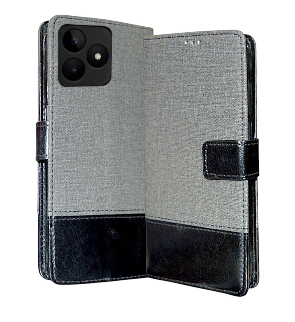 Bintage Dual Colour Joint Denim Cloth & Vegan Leather Magnetic Case Cover with Card & Cash Wallet Flip Cover Compatible for Realme Narzo N61 – Grey & Black