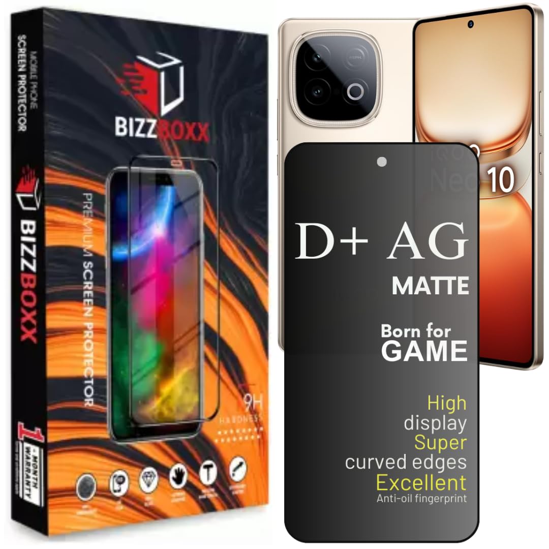 BizzBoxx Iqoo Neo 10 D+ AG Matte Tempered Glass Screen Guard Protector Edge-To-Edge Protector Anti Fingerprint Gaming Special With Camera Cut (Iqoo Neo 10-6.78 Inch)- Pack Of 1
