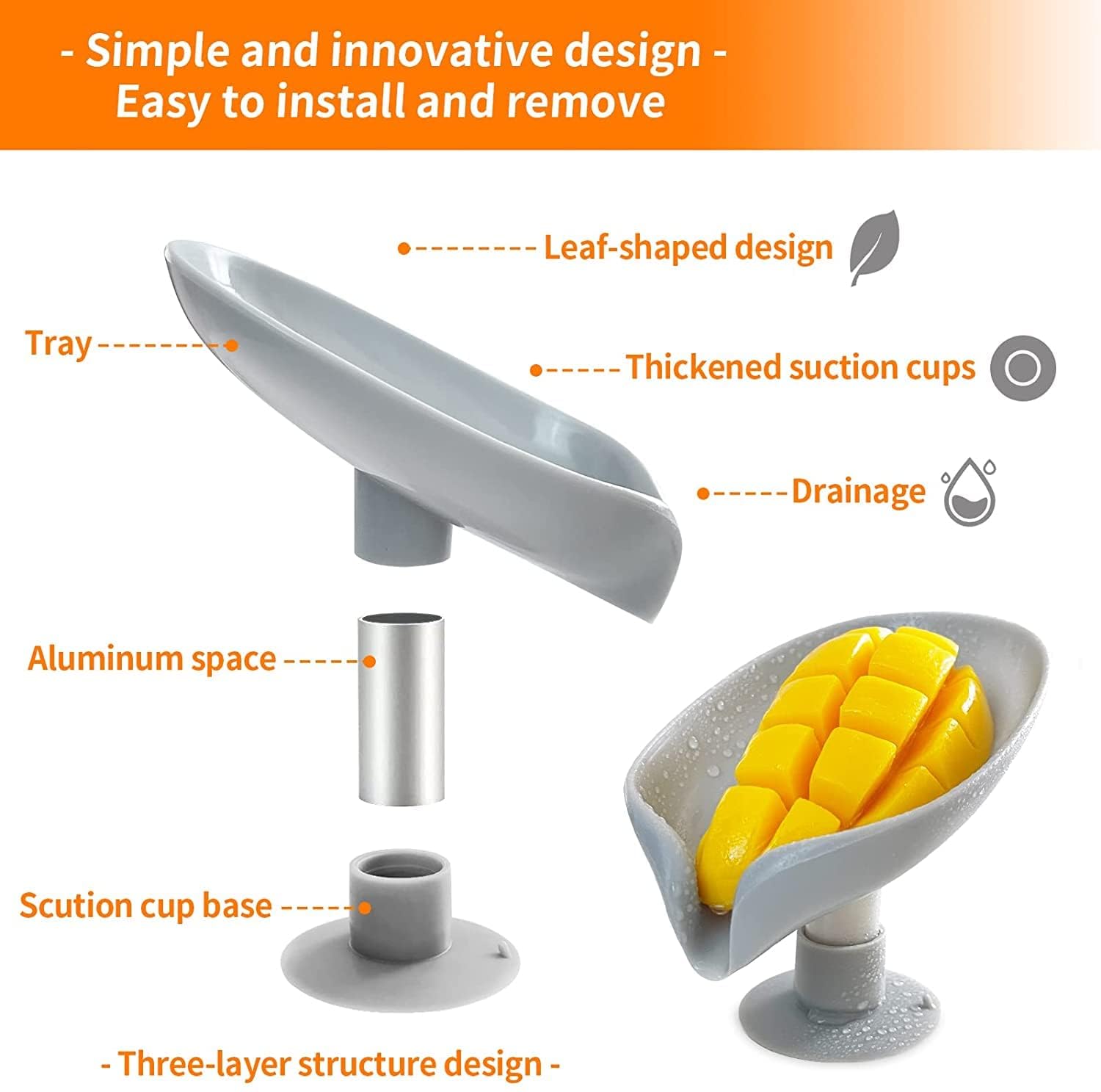 We adopt the leaf shape design, which makes water flows down naturally and keeps the soap dry all the time. With the Innovative design, This soap dish will make your bathroom beautiful and improving life quality. Soap Holder’s suction works best on ceramic tile, granite tiles, stainless steel, plastic, and any non-porous smooth surfaces. Some natural soaps will turn to a liquid mush, This Leaf Shape soap holder keeps soap from being mushy. Soap holder Inside the excess water will be automatically drained back to the sink. This soap holder will preserve the life of your soap.The soap tray allows water to flow directly into the sink, away from dirty sink, slippery and softens soap.This soap holder made of high-quality plastic, outstanding texture, durable and easy to clean.The soap box is easy to install with no need to punch holes. You can pull up and move to the position you want.