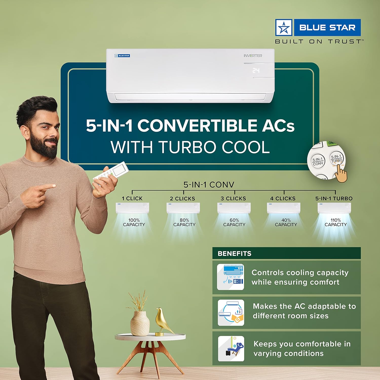 5-in-1 Convertible Cooling: Unique 5-in-1 cooling mode to run your AC at 5 different capacities as per the desired comfort. It comes in combination of 2 buttons in the remote. Split AC with inverter compressor: Variable speed compressor which adjusts power depending on heat load.