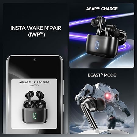boAt Airdopes 141 Pro Buds, 13mm Drivers, Metallic Finish, 60HRS Battery, 4Mics ENx, Fast Charge, IPX5, v5.3 Bluetooth TWS in Ear Earbuds Wireless Earphones with mic (Obsidian Black)