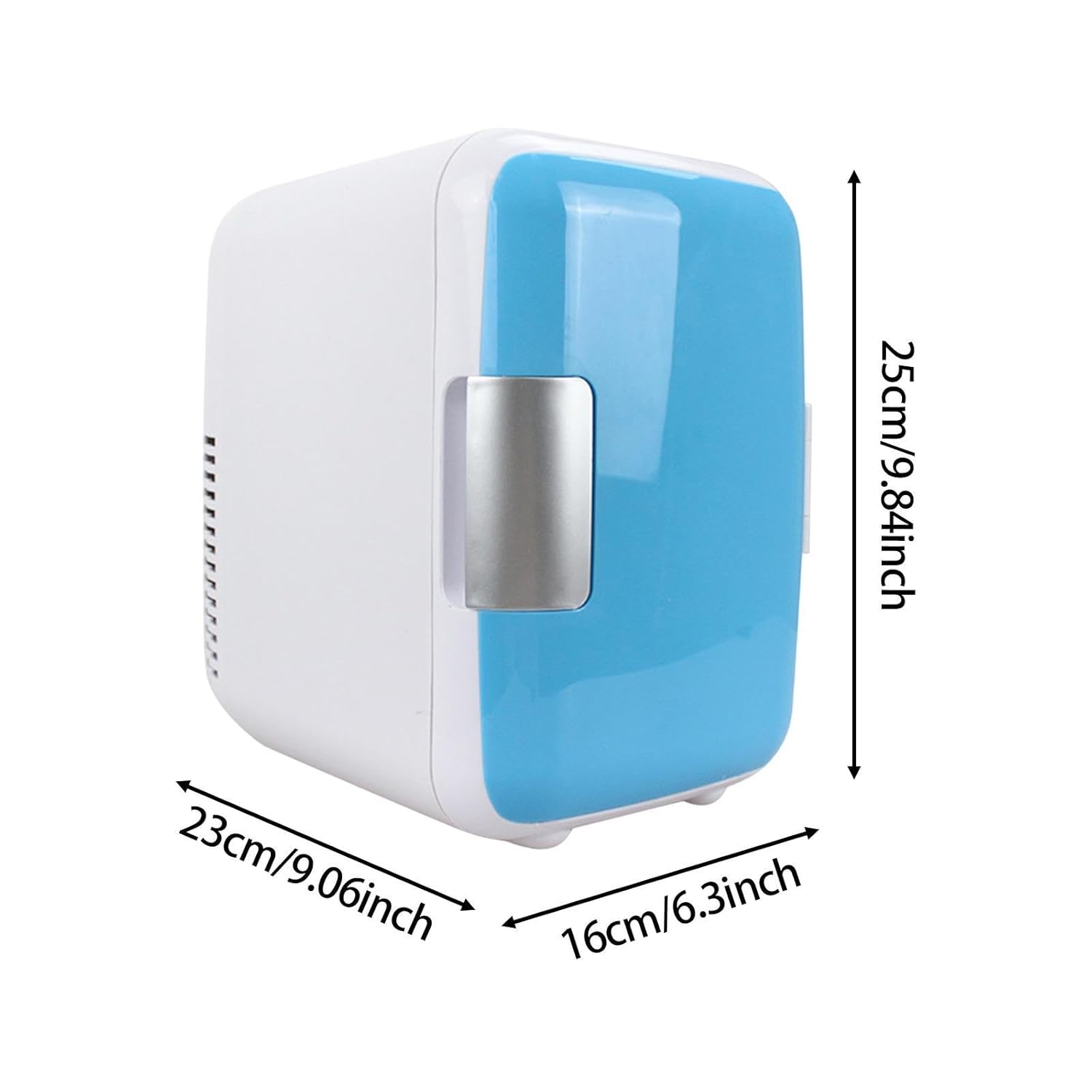 Save Space: Mini fridge has 4 Liter capacity, holds 6 can, compact size, suitable for 12V automotive and small places use. 9.06inchx6.30inchx9.84inch