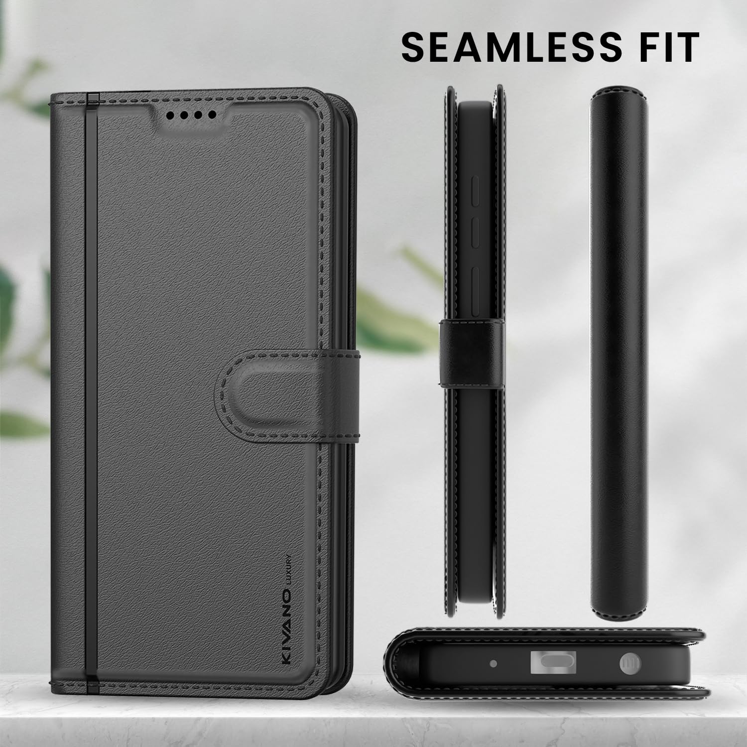 The KIVANO LUXE Artisanal Leather Wallet Case combines premium leather, a magnetic flip design, built-in card holder, RFID blocking, and a stand for hands-free viewing, offering seamless protection and style.