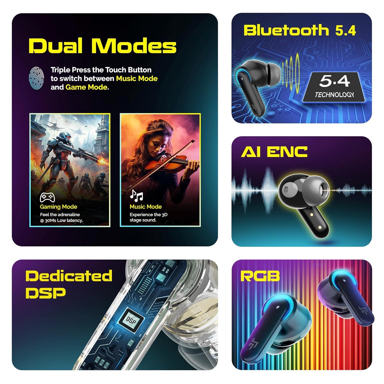 CrossBeats Fury Max Gaming TWS in-Ear Buds |100hr Playtime Bluetooth Earphones | RGB Lights | BT v5.4 | 30ms Low Latency | 360° Spatial Audio | 3D Sound Stage | 6 mics AI ENC | Dual EQ Modes(Black)