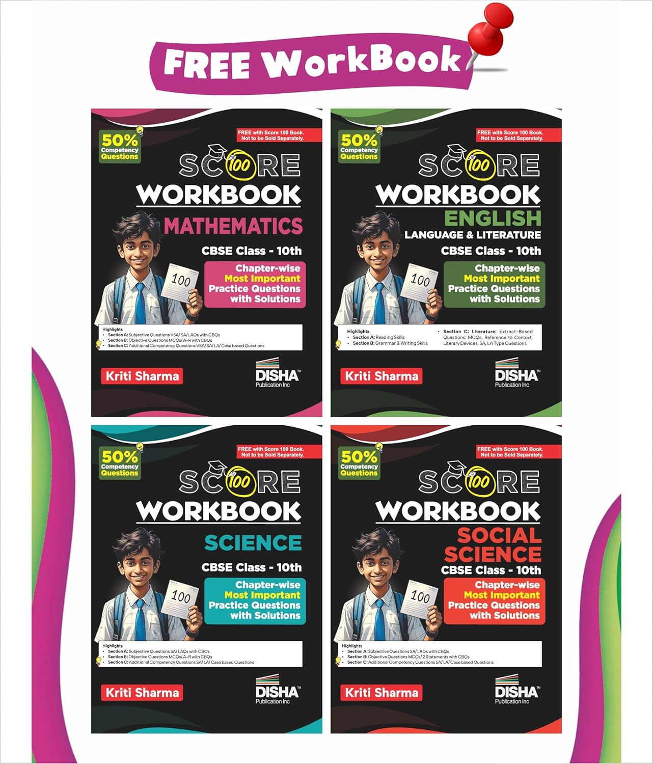 Disha (Set of 4 Books with 4 Workbooks) Score 100 Science, Mathematics (Standard), Social Science, English Language & Literature CBSE Class 10 – 10 Year-wise Solved Papers (2016 – 2025) 5th Edn | 2026 Exam