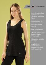 Dollar Thermal Ultra, a perfect blend of comfort, warmth, and style. Crafted from premium combed cotton rich ‘brushed interlock’ fabric, this thermal wear promises unmatched softness and durability, keeping you cozy on the coldest days. The snug, tailored fit enhances your silhouette while providing optimal insulation. Dollar Thermal Ultra features blind reinforced seams to prevent any irritation, ensuring a smooth, no-itch wear experience. The low neck design adds versatility, making it an excellent choice for layering under various outfits. Available in a comfortable standard round neck with picoting, this thermal wear caters to all your fashion needs. The sleeveless design adds a stylish touch, making it perfect for both indoor and outdoor wear.