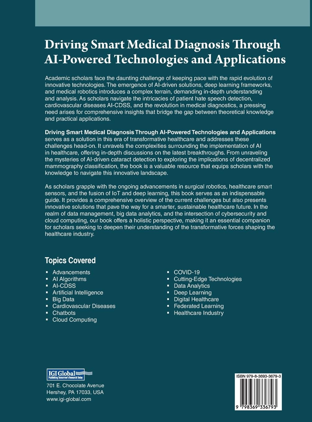 Academic scholars face the daunting challenge of keeping pace with the rapid evolution of innovative technologies. The emergence of AI-driven solutions, deep learning frameworks, and medical robotics introduces a complex terrain, demanding in-depth understanding and analysis. As scholars navigate the intricacies of patient hate speech detection, cardiovascular diseases AI-CDSS, and the revolution in medical diagnostics, a pressing need arises for comprehensive insights that bridge the gap between theoretical knowledge and practical applications. Driving Smart Medical Diagnosis Through AI-Powered Technologies and Applications serves as a solution in this era of transformative healthcare and addresses these challenges head-on. It unravels the complexities surrounding the implementation of AI in healthcare, offering in-depth discussions on the latest breakthroughs. From unraveling the mysteries of AI-driven cataract detection to exploring the implications of decentralized mammography classification, the book is a valuable resource that equips scholars with the knowledge to navigate this innovative landscape.