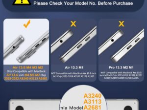 ✔️Only Compatible with MacBook Air 13.6 inch M4 M3 M2, 2025 2024 2022 Release, ✔️Model&Chip: A3240(M4) A3113(M3) A2681(M2). Please check the mac laptop model “AXXXX” on the back before purchasing. ✔️Please note that due to differences in size and interface layout among different laptop models, this protective case is not suitable for other mac models