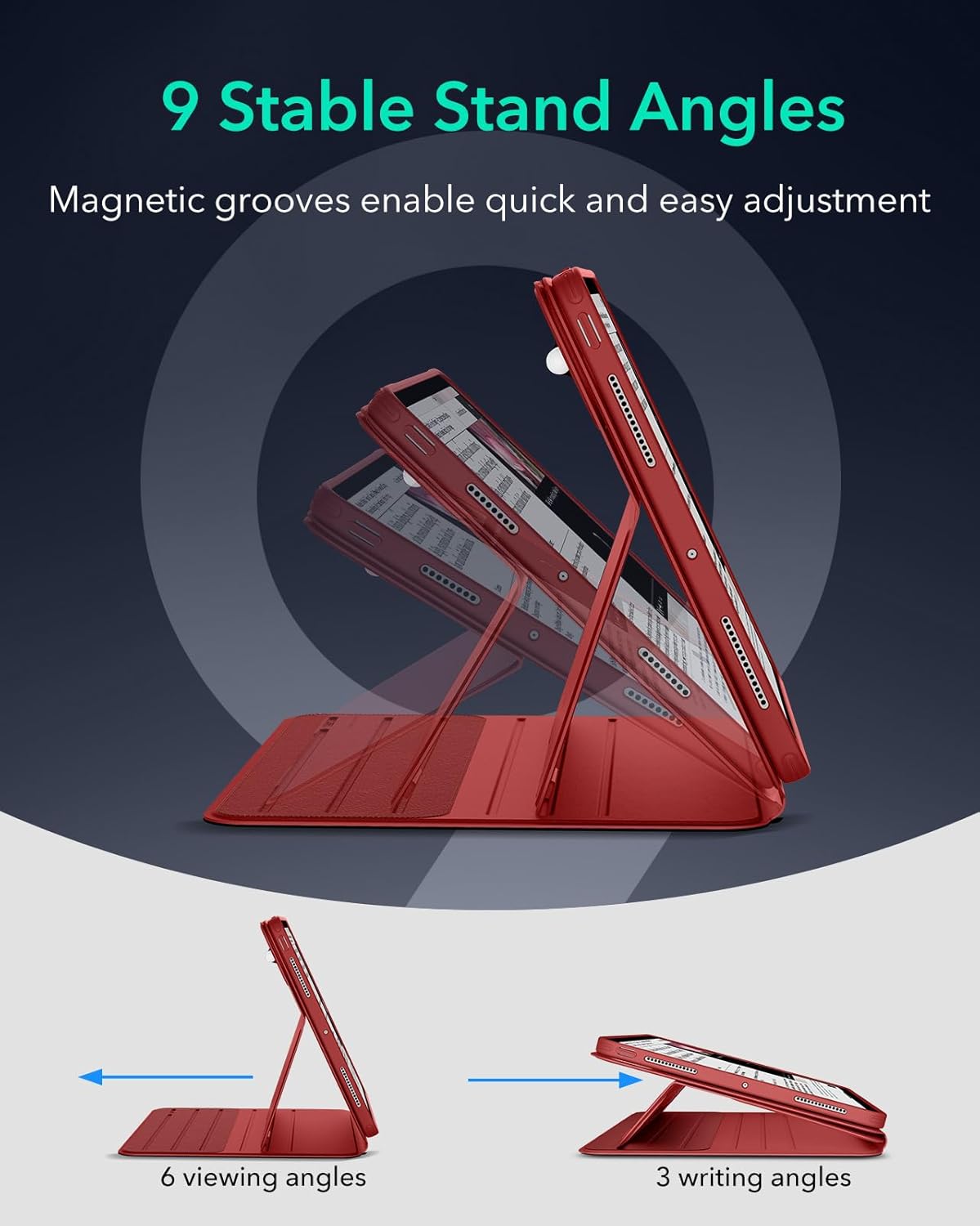Powerful Versatility: achieve up to 9 different angles, 6 for viewing and 3 for writing, via the dual support brackets and 6 magnetic grooves, then instantly detach for hands-on gaming or to magnetically attach to your fridge