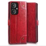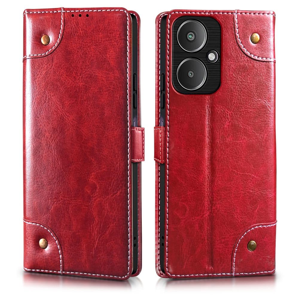 FLIPPED Vegan Leather Metal Garnish Design Flip Case Back Cover for Mi Redmi 13C 5G | Redmi 13C 4G | Poco M6 5G | Poco C65 | Hand-Stitched Finish | Card Pockets Wallet & Stand Function | Cherry Red