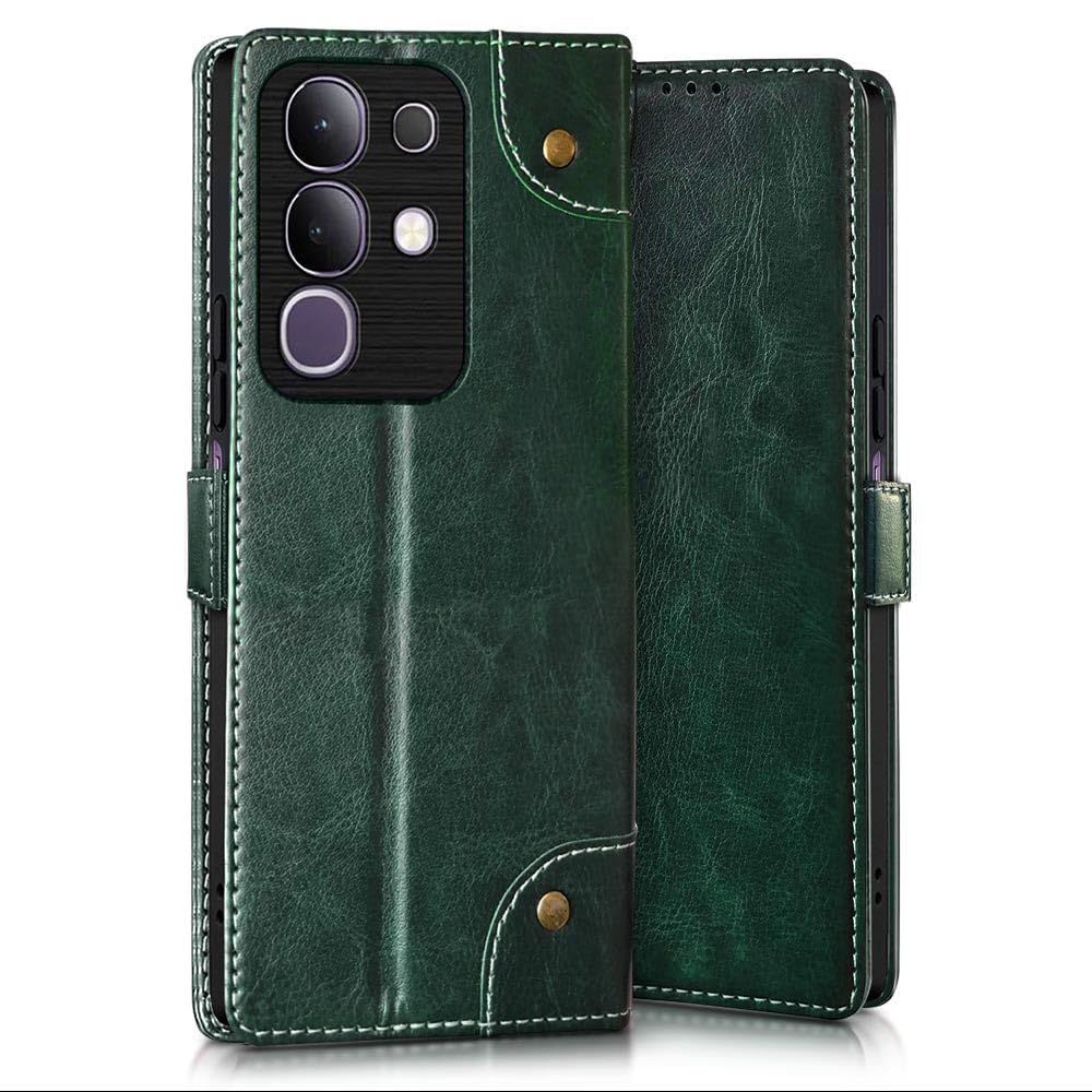 FLIPPED Vegan Leather Metal Garnish Design Flip Case Back Cover for Vivo T4X 5G | IQOO Z10X 5G | Shockproof Lightweight | Hand-Stitched Finish | Card Pockets Wallet & Stand Function | Deep Green