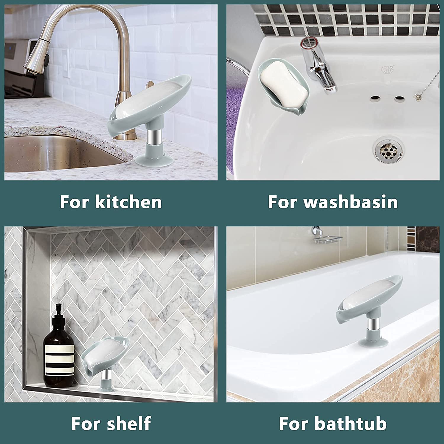 Leaf Shape The soap holder Dish for Adopts Waterfall Self-Draining Structure, Dries The Soap More Easily and Drain Quickly reduce waste, Stop Mushy Soap.This Tray Of This Self Draining Bar Soap Holder Has 1 Movable Silicone Suction Cups On The Bottom. You Don’t Need To Punch Holes, And It Has Strong Adhesion To Keep The Soap Holder Box Stable.You No Need to Dump The Water Out of The Soap Holder.