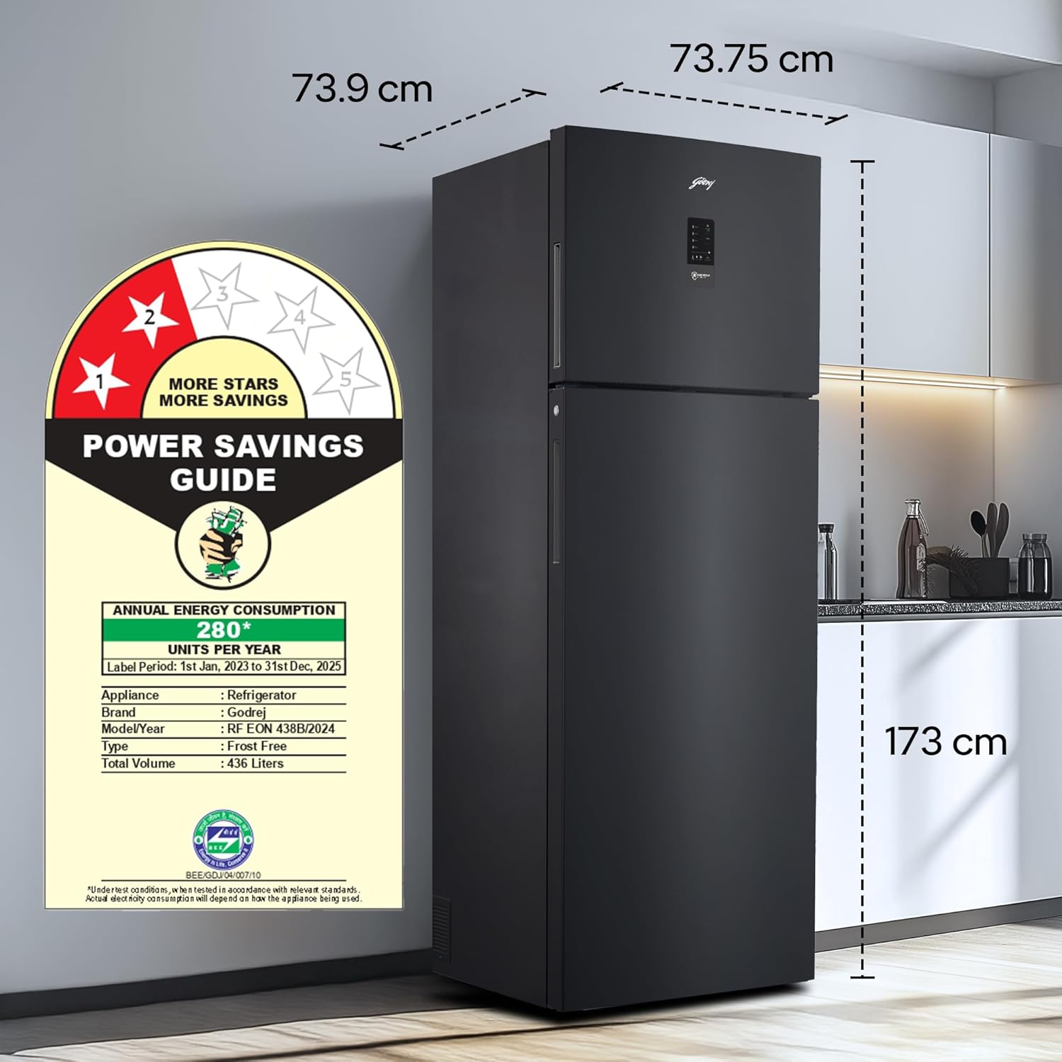 Godrej 436 L 2 Star With AI Tech, 95%+ Food Surface Disinfection With Nano Shield Technology Inverter Frost Free Double Door Regalis Refrigerator (RF EON 438B RCI MT BK, Matt Black)
