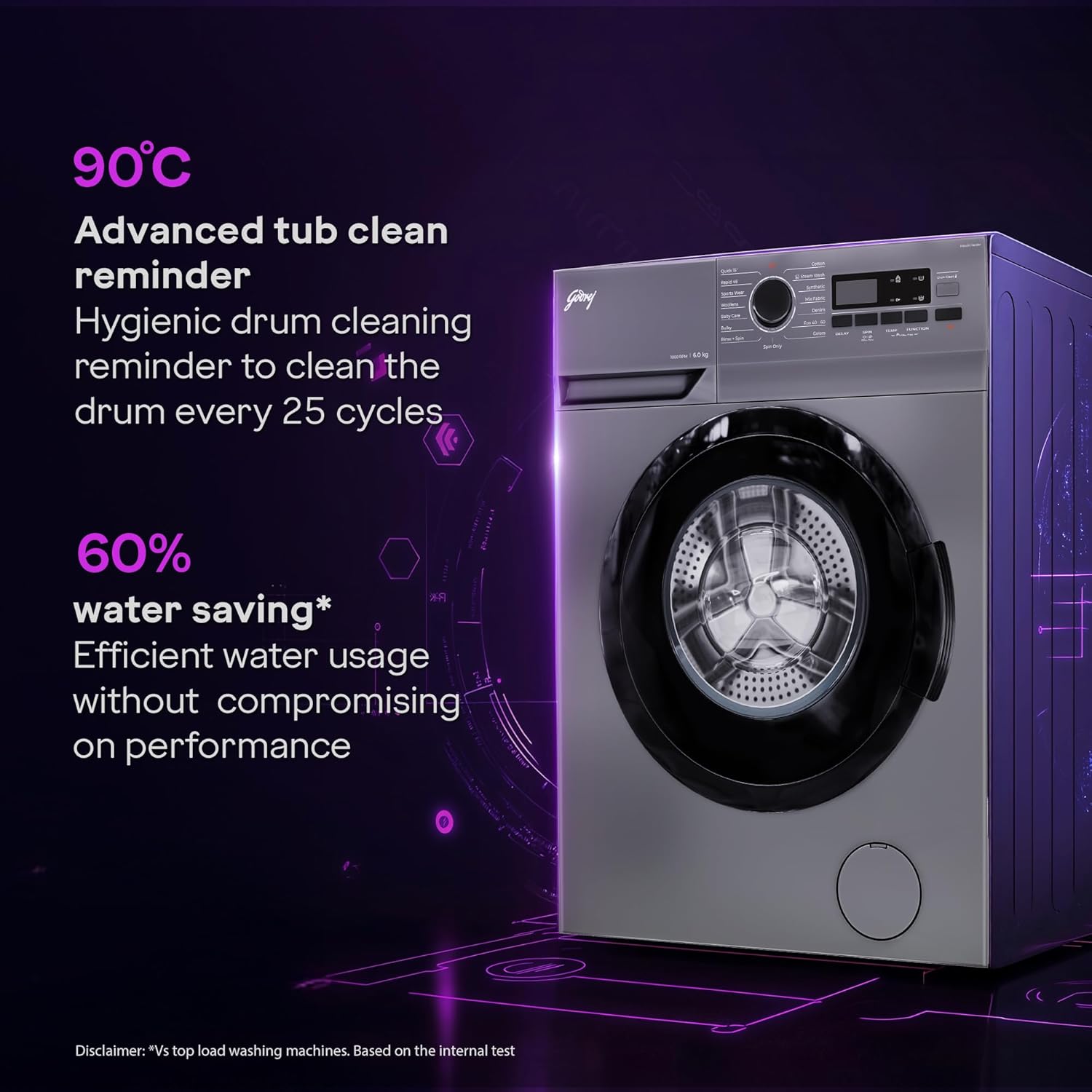 Drum / Pulsator Type : Stainless steel acu wash drum | Drum is washed hygienically at a temperature of 90 ºC The Drum clean LED starts blinking automatically after 25 Cycles & serves a s reminder to clean the drum
