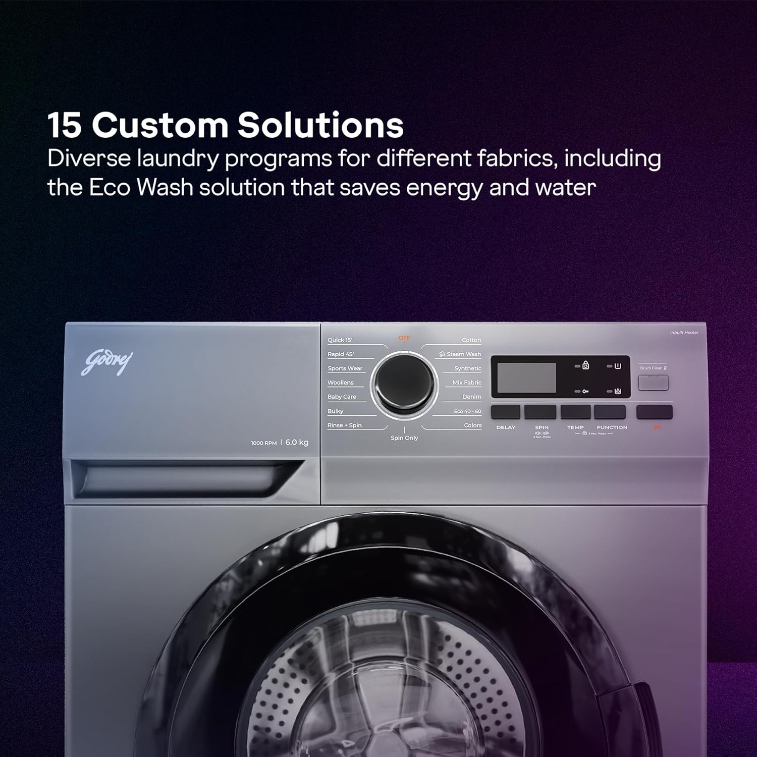 Wash programs: 15 Wash Programs: It provides the flexibility of choosing the right program from 15 wash programs like Steam wash, Cotton, Spin, Colors, Sports wear, Woollen, Baby care, Bulky, Rinse+spin, Synthetic, Mix fabric, Denim, eco, Rapid 45, Quick 15, etc as per the cloth type of the user