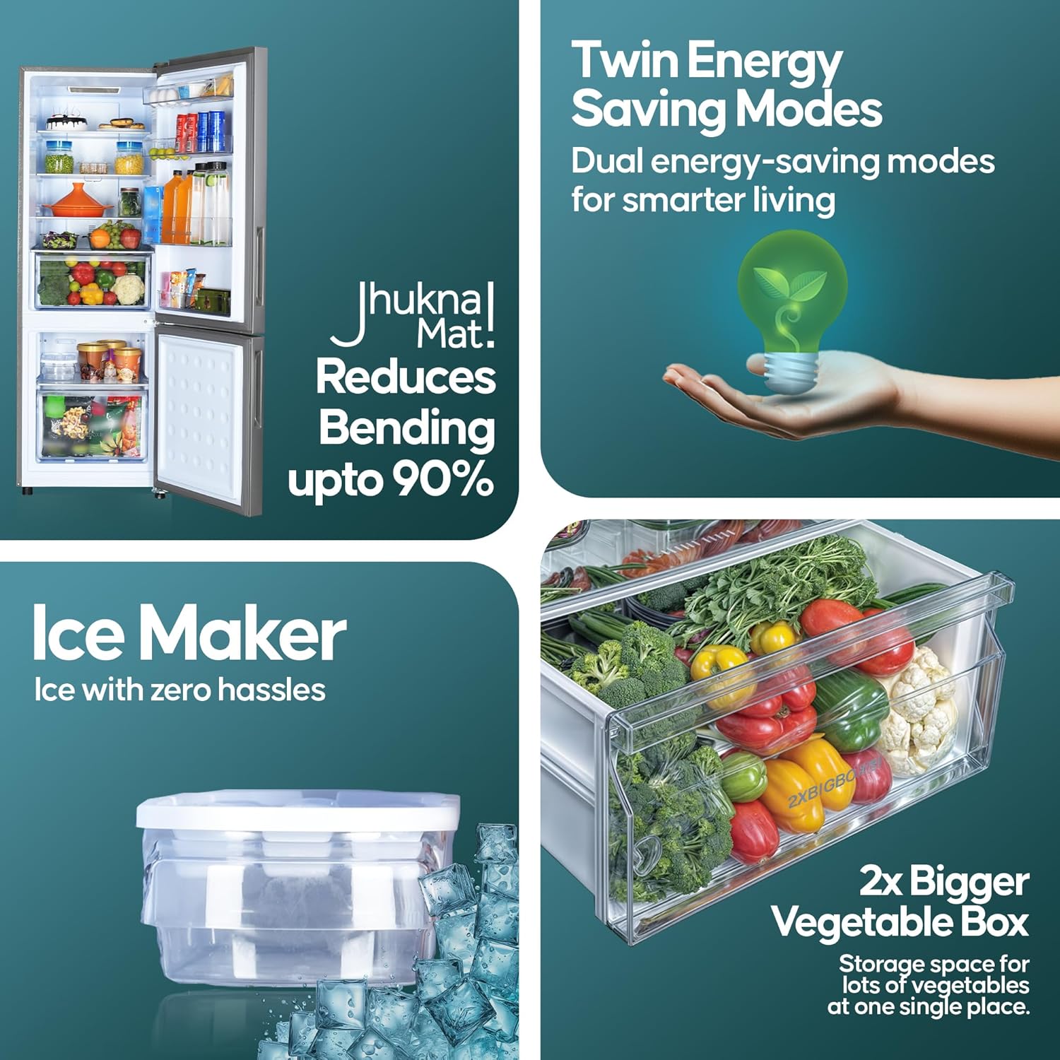 Haier 237L 3 Star Frost Free Bottom Mount Double Door Refrigerator|8 In 1 Convertible Modes|Jhukna Mat-Bottom Freezer|Twin Inverter|200% Faster Ice Making in 49 Minutes (HEB-243GS-P, Moon Silver)