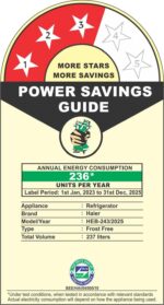 Energy Rating : 3 Star Energy Efficiency | Annual Energy Consumption: 236 Kilowatt Hours Per Year