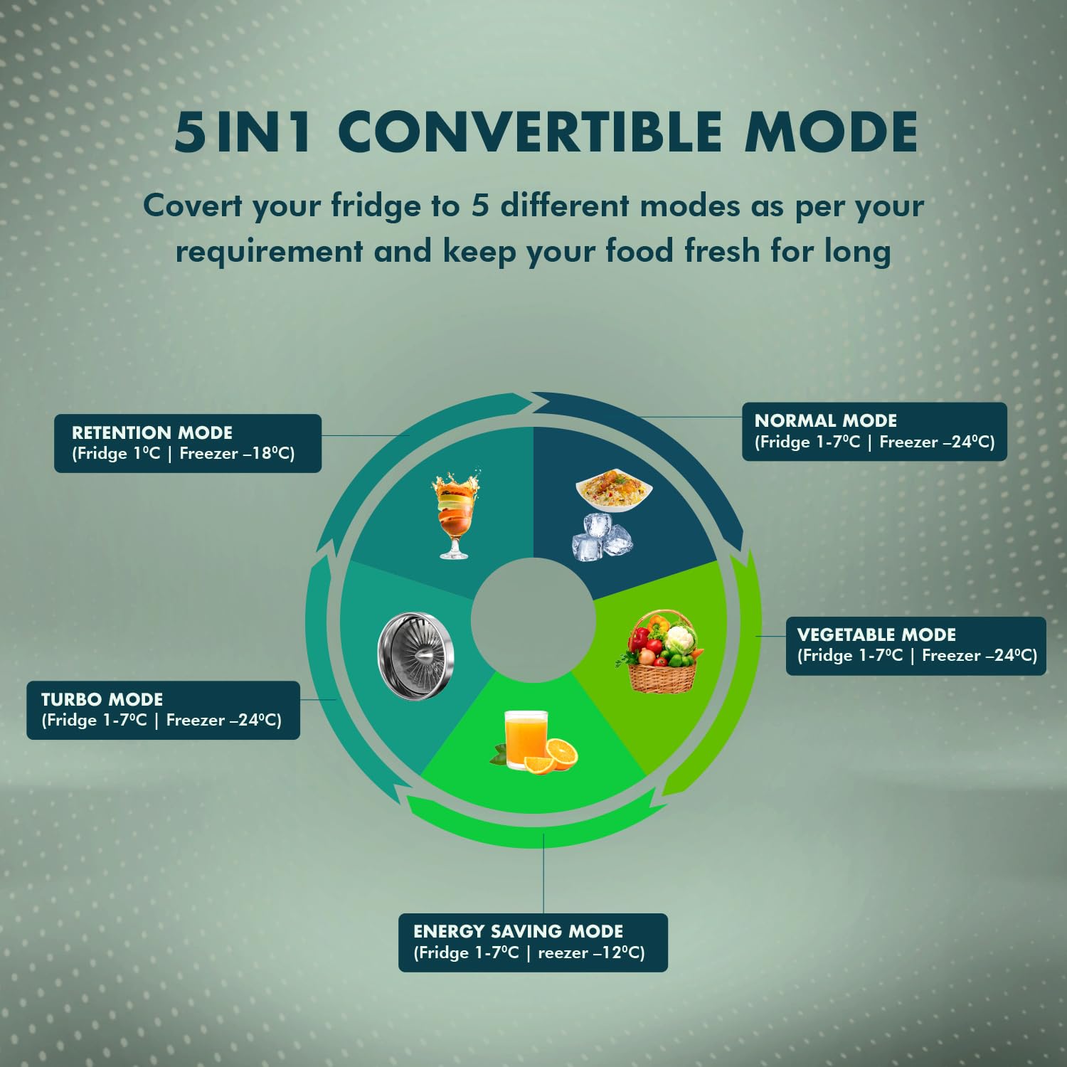 Frost Free Refrigerator: Premium auto defrost with powerful cooling and long lasting freshness and performance. Manage your flexible storage needs with convertible 5 in 1 technology of this double door fridge: Normal Mode | Veg Mode | Power Saving Mode | Turbo Icing Mode | Retention Mode.