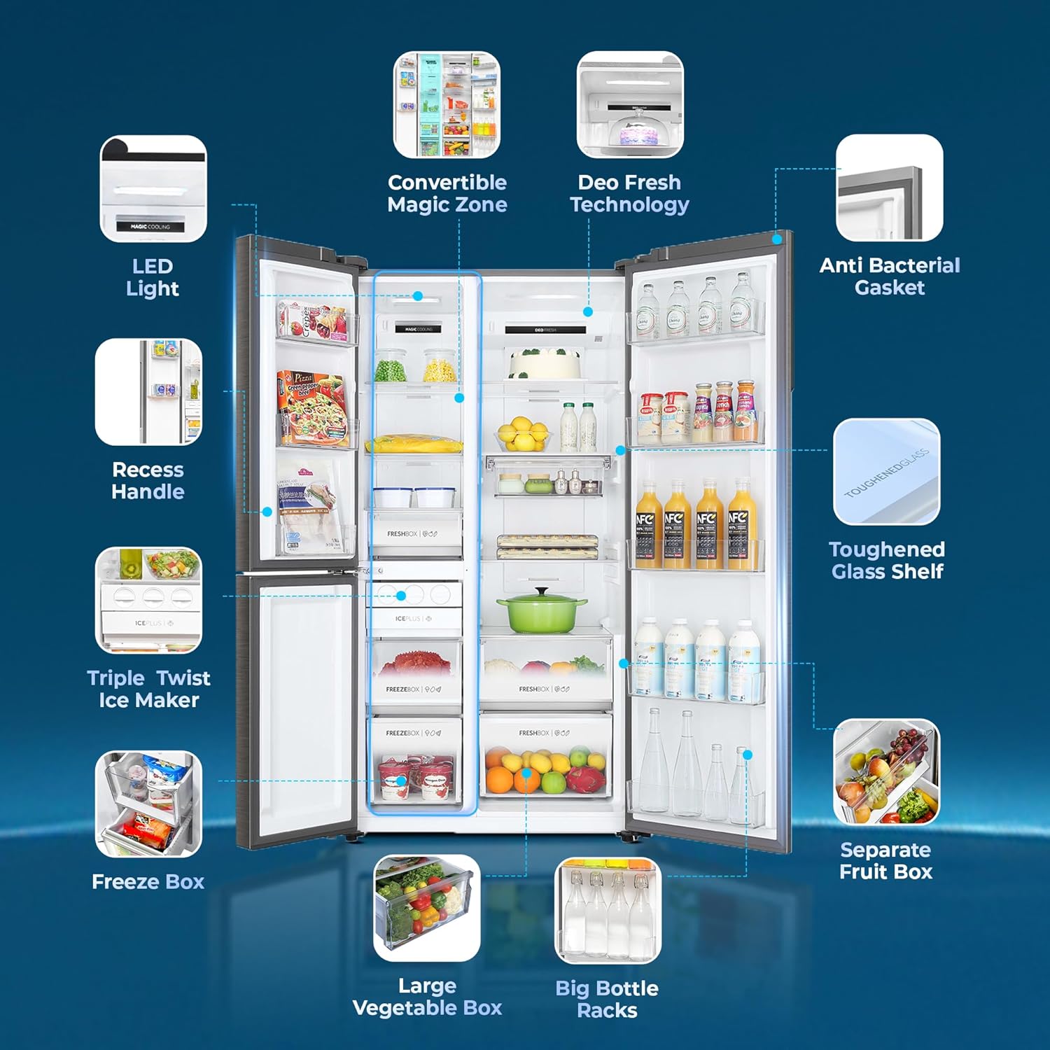 3-Door Side By Side Frost-Free Refrigerators: 3-Door Refrigerator with Water Dispenser & Smart Sense AI Technology. Regulate temperature settings ranging from -18°C to 5°C with magic convertible zone.