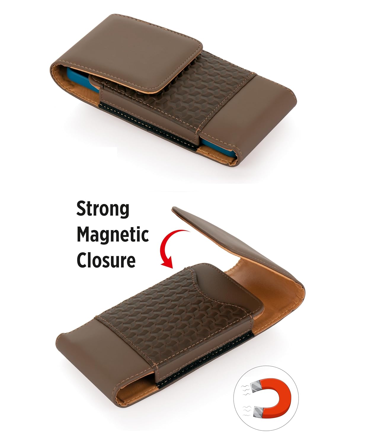The flap is held together magnetically and is calibrated to be non-harmful to electronic devices. This allows for easy removal and replacement of your mobile device.