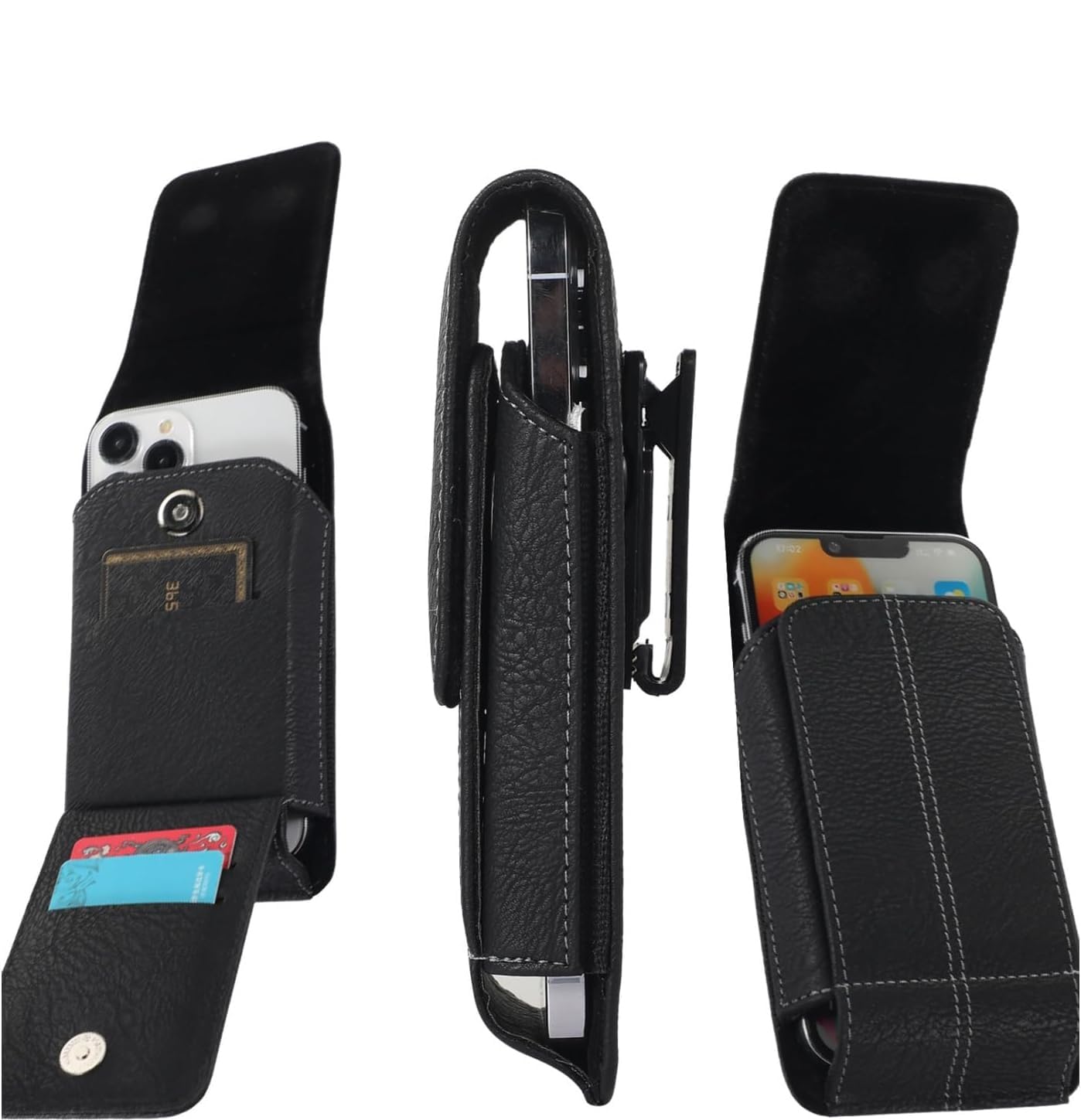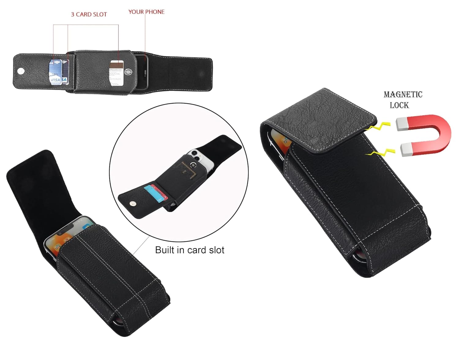 This phone belt holster fit for most 5.5-6.8 inch smartphone, Belt pouch with Card Holder to hold 3 to 6 Cards, 360° Rotatable Belt Clip for Vertical / Horizontal Orientation & Magnetic Flap for Protection, Premium Quality PU Leather for complete protection, Universally compatible for all smartphones.