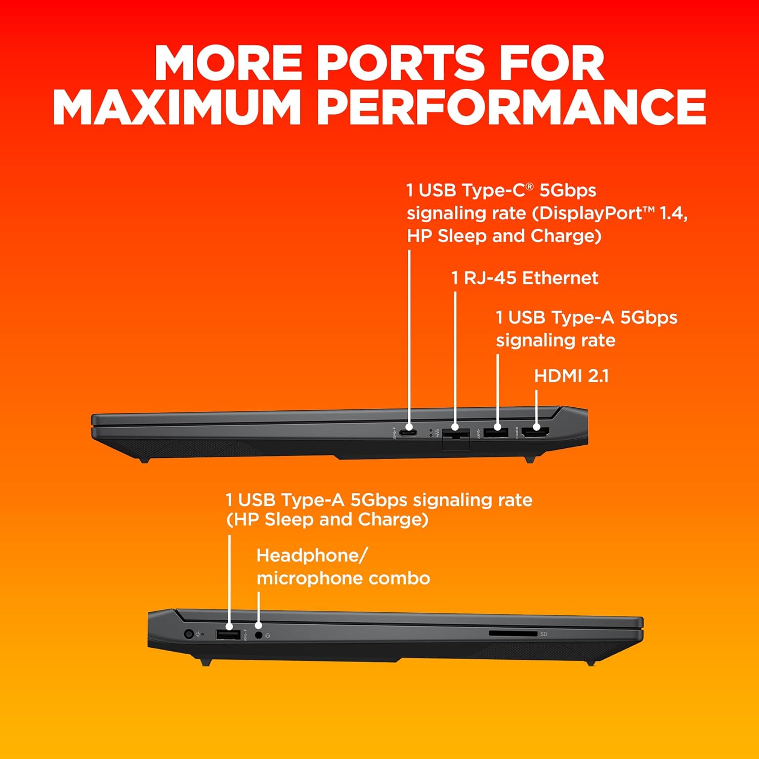 Ports : 1 USB Type C 5Gbps signaling rate (Display Port 1.4, HP Sleep and charge), 1 USB Type-A 5Gbps signaling rate (HP sleep and charge) ,1 USB Type-A 5Gbps signaling rate, 1RJ-45,1 headphone/microphone combo, 1 AC smart pin, 1 HDMI 2.1