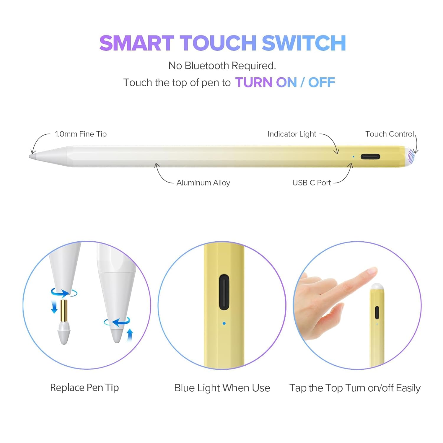 JAMJAKE Stylus Pen for iPad 6th-11th Generation-2X Fast Charge Active Pencil Compatible with 2018-2025 Apple iPad Pro 11″/12.9″/M4, iPad Air 3/4/5/M2/M3,iPad mini 5/6 Gen-White Yellow