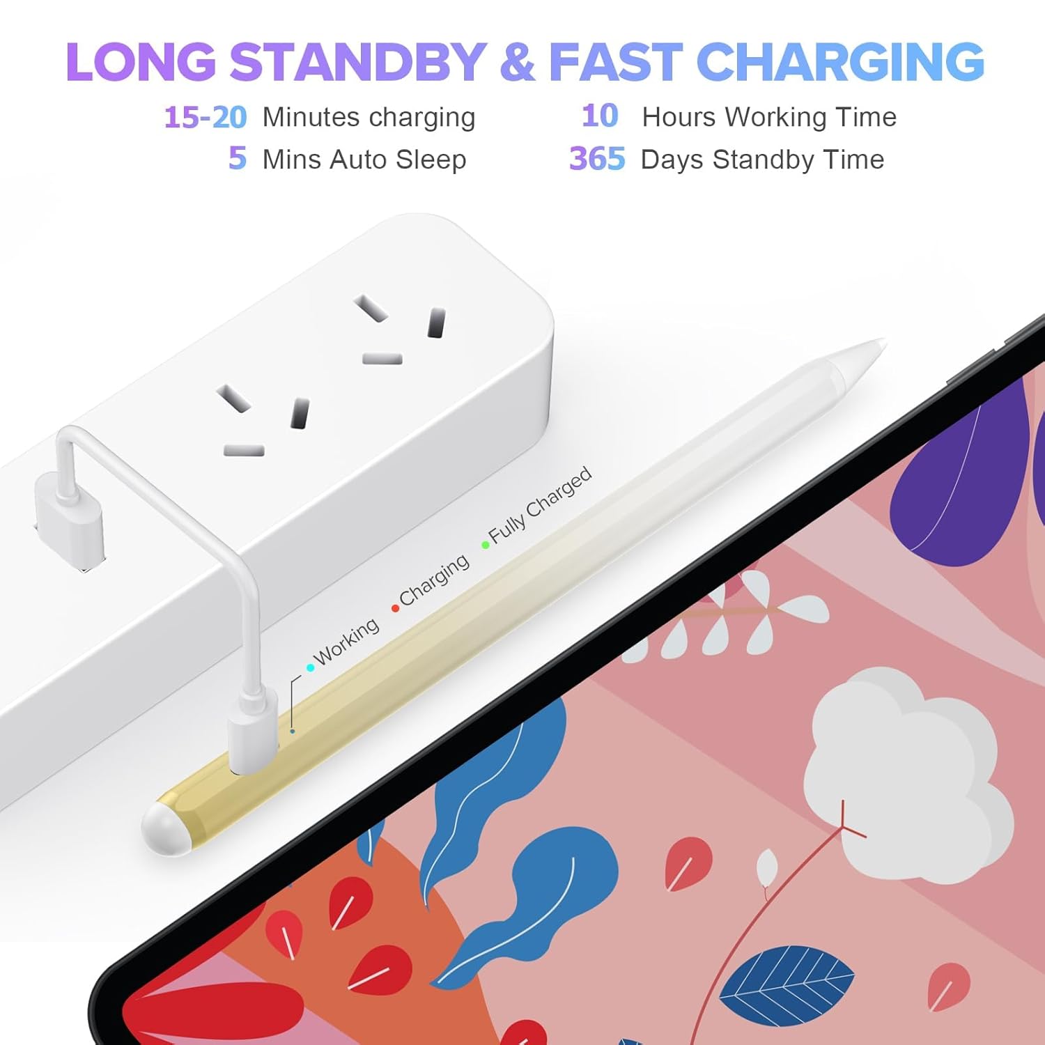 【Touch Switch & Fast Charging】No need for Bluetooth connection, turn on this stylus pen by simply touching the cap button,charging 10 minutes, can support the work of 8-10 hours