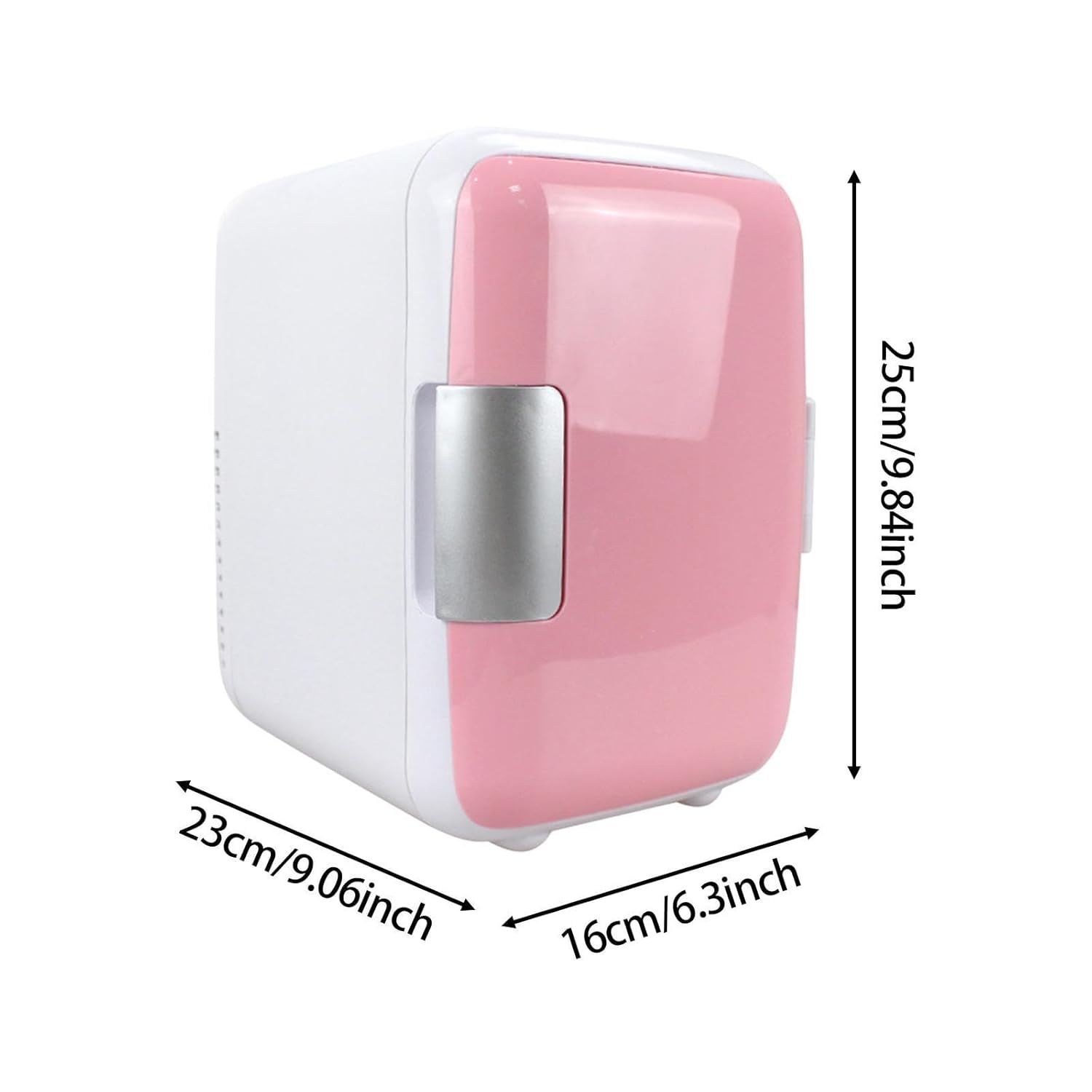 Save Space: Mini fridge has 4 Liter capacity, holds 6 can, compact size, suitable for 12V automotive and small places use. 9.06inchx6.30inchx9.84inch