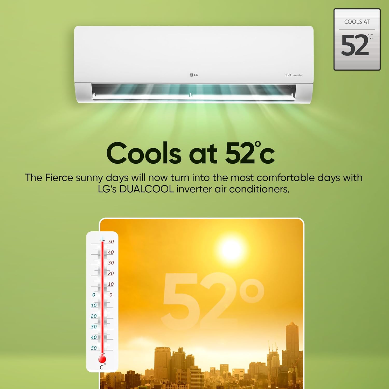 Key Features: Dual Inverter Compressor – faster cooling, most savings and almost noiseless operation | AI Convertible 6-in-1 Cooling – one touch air conditioning for appropriate cooling and sensing room conditions | VIRAAT Mode – Maintains 110%* cooling capacity, that provides instant cooling for maximum user comfort (*Maximum Cooling Capacity may vary Model to Model from 110% to 116%)| 4 Way Air Swing | HD Filter with Anti-Virus Protection | ADC Sensor | Cools at 52⁰ C – Fastest cooling for higher outdoor temperatures up to 52° C | Stabilizer free operation within 120V-290V voltage range | Magic Display for temperature | Noise Level: IDU – 21 (db) & ODU – 55 (db)