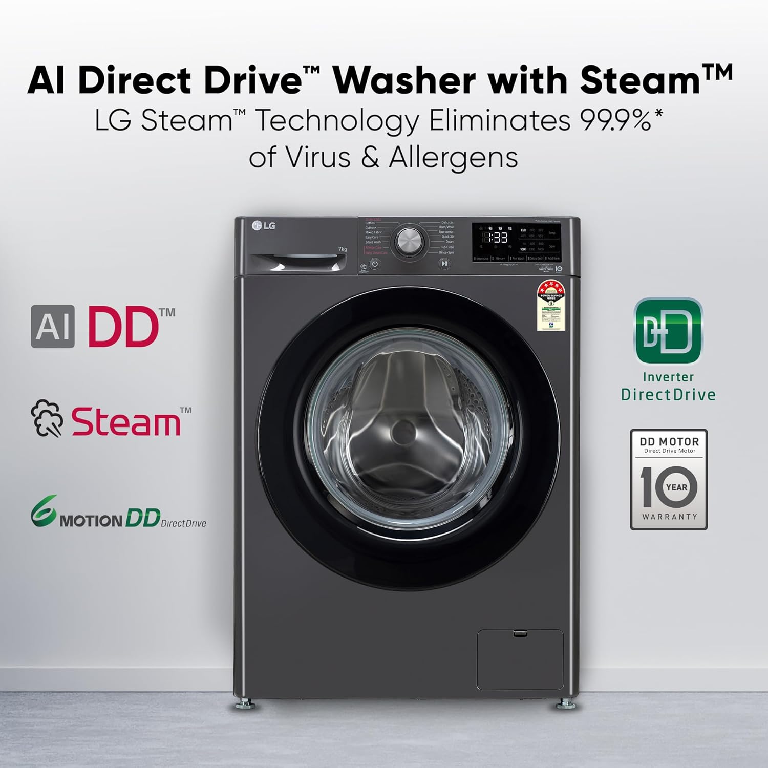 Fully-automatic front load washing machine with Hygiene Steam removes allergens & AI Direct-Drive Technology: Best Wash Quality, Energy and Water efficient