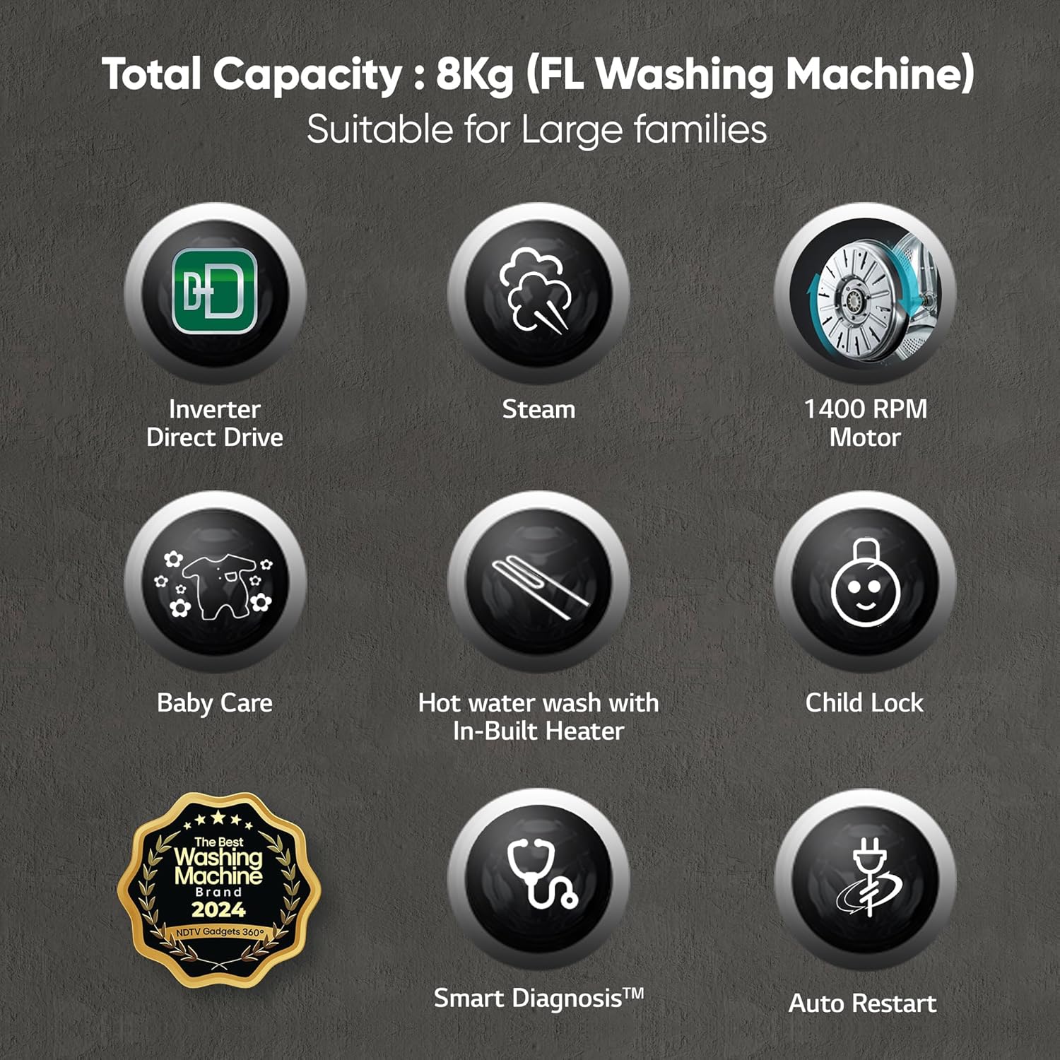 LG 8 Kg, 5 Star, Direct Drive Technology, Steam Wash, 6 motion DD, Smart Diagnosis, Fully Automatic Front Load Washing Machine (FHM1408BDW, Allergy Care, In-Built Heater, Touch Panel, White)