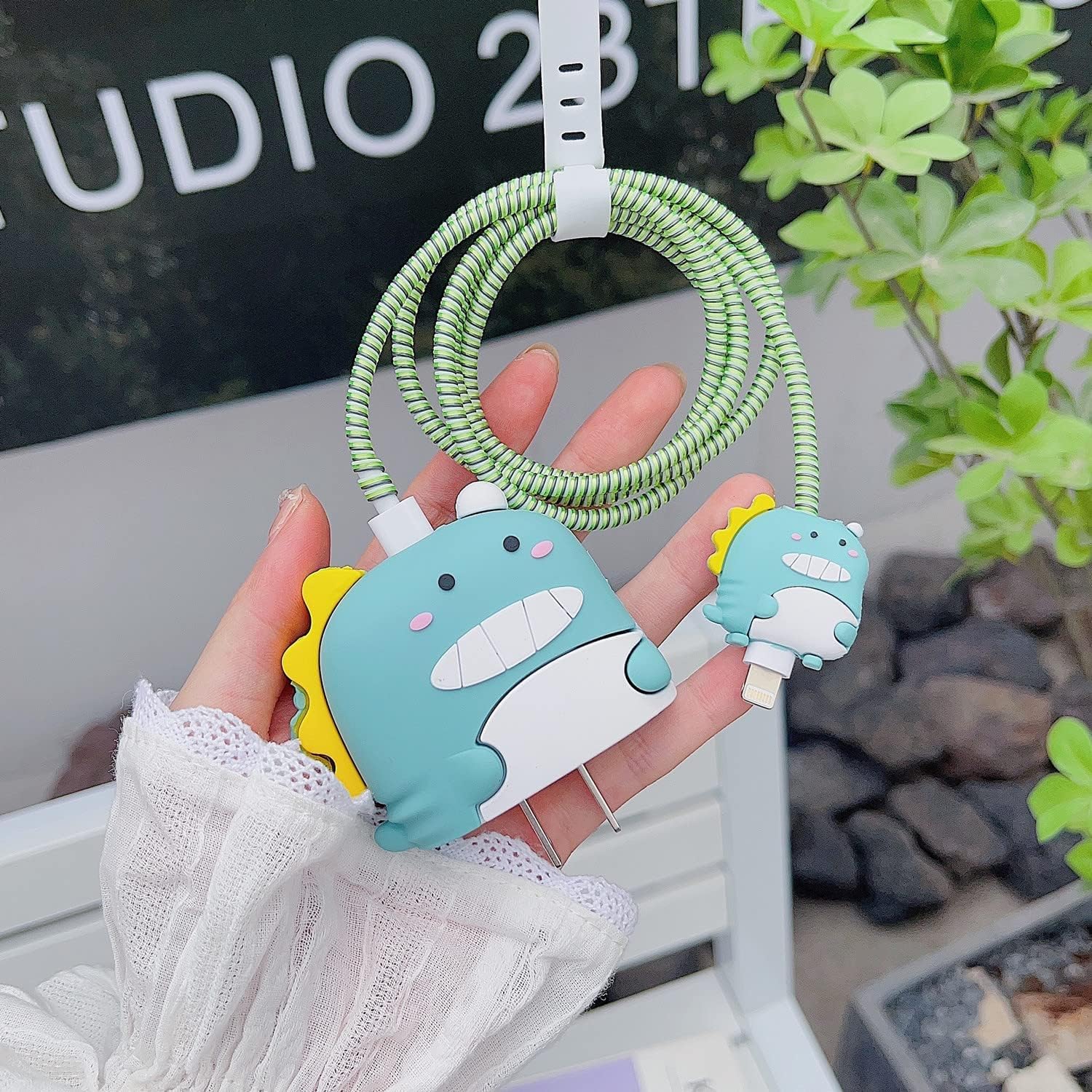 Like Star Protective Case Cover 4in1 Compatible with Apple 20W/18W iPhone USB-C Power Adapter Charger Protection Case with Wire Saver,3D Cartoon Character Case 360 Degree Protection Cover(Dyno Green)