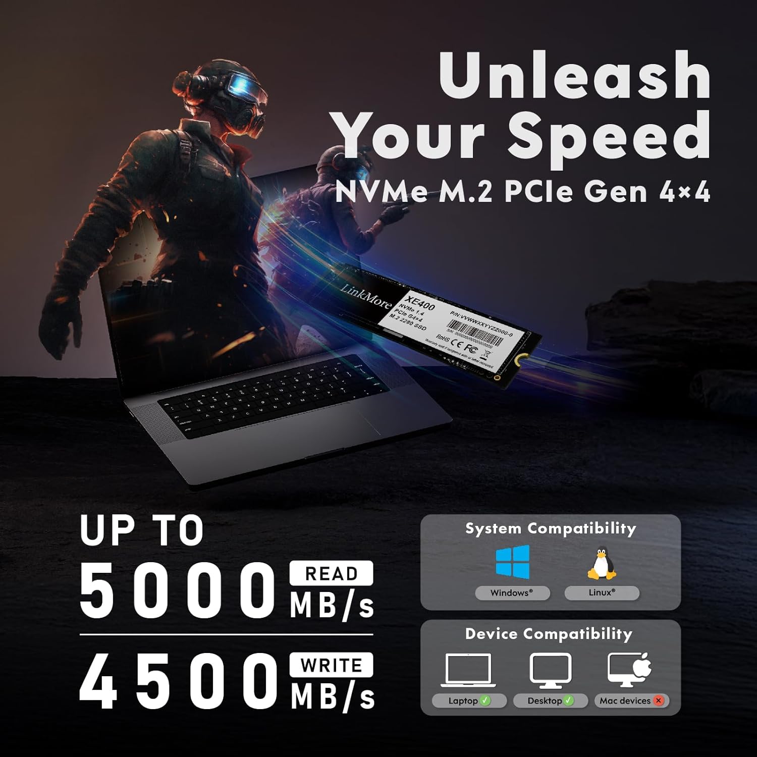 LinkMore XE400 1TB M.2 2280 PCIe Gen 4X4 NVMe 1.4 Internal SSD, PS5 Compatible, Solid State Drive, Up to 5000MB/s for Latop and PC