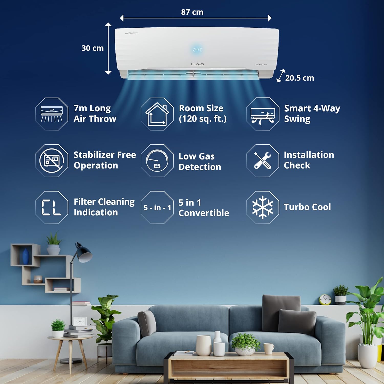 Lloyd Split AC with Inverter Compressor: AC with variable speed compressor which automatically adjusts power depending on room temperature & heat load. Convertible / adjustable with 5 cooling modes through remote control to operate in different tonnages for different cooling needs (30% to 110% capacity)