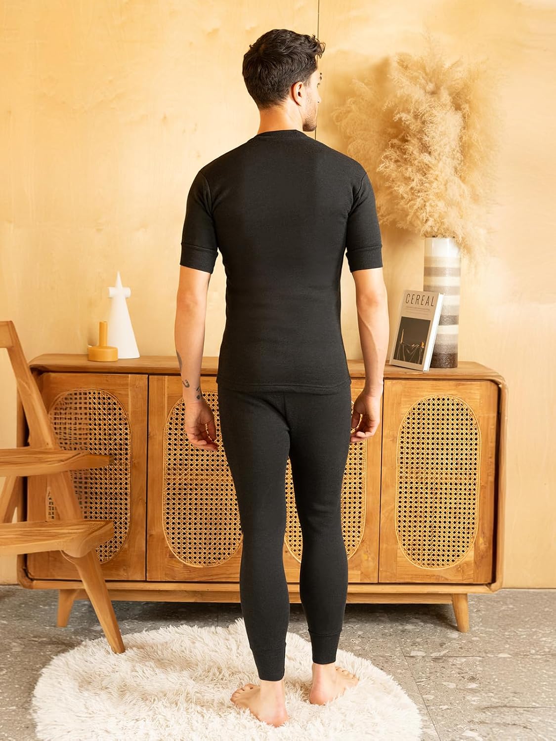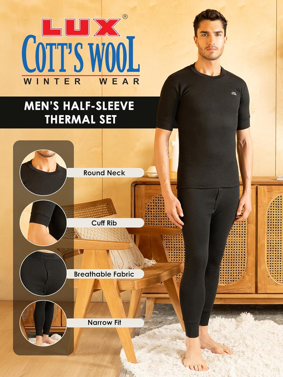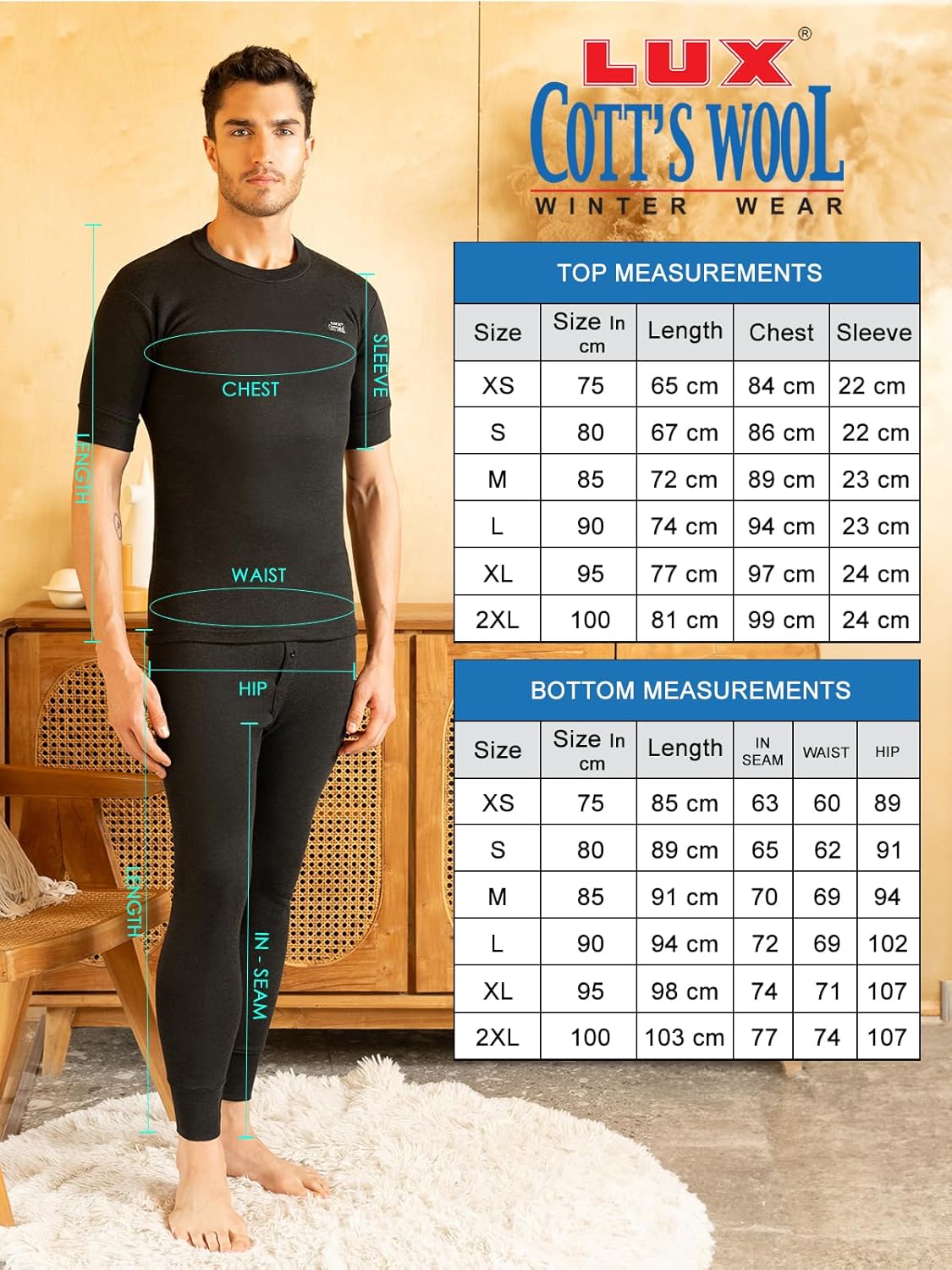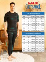 Lux Cott’sWool Round neck Half Sleeves Thermal Set. A body-hugging thermal wear for icy days and chili nights Made from exceptional soft cotton, processed to draw moisture away Designed to be worn as underpants Available in Front open bottom for extra comfort. XS=75cm, S=80cm, M=85cm, L=90cm, XL=95cm, XXL=100cm,