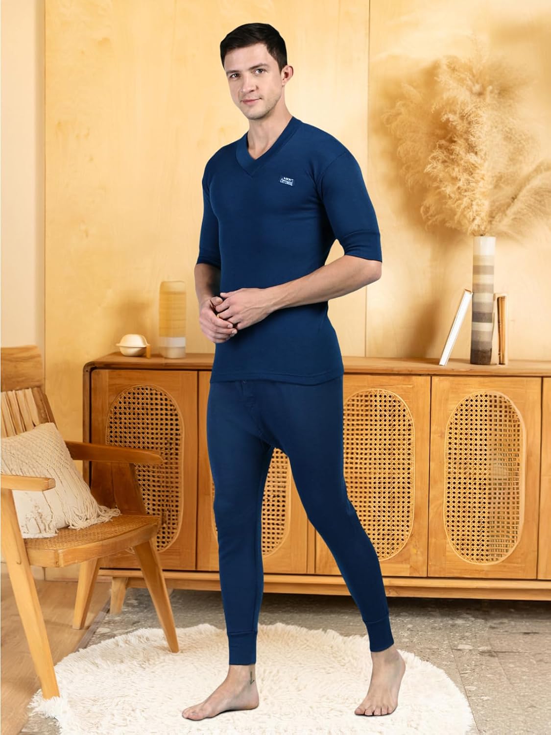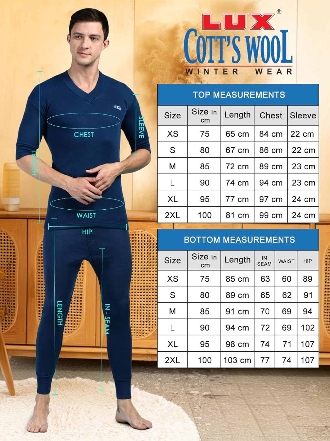 Lux Cott’sWool V neck Half Sleeves Thermal Set. A body-hugging thermal wear for icy days and chili nights Made from exceptional soft cotton, processed to draw moisture away Designed to be worn as underpants Available in Front open bottom for extra comfort. XS=75cm, S=80cm, M=85cm, L=90cm, XL=95cm, XXL=100cm,