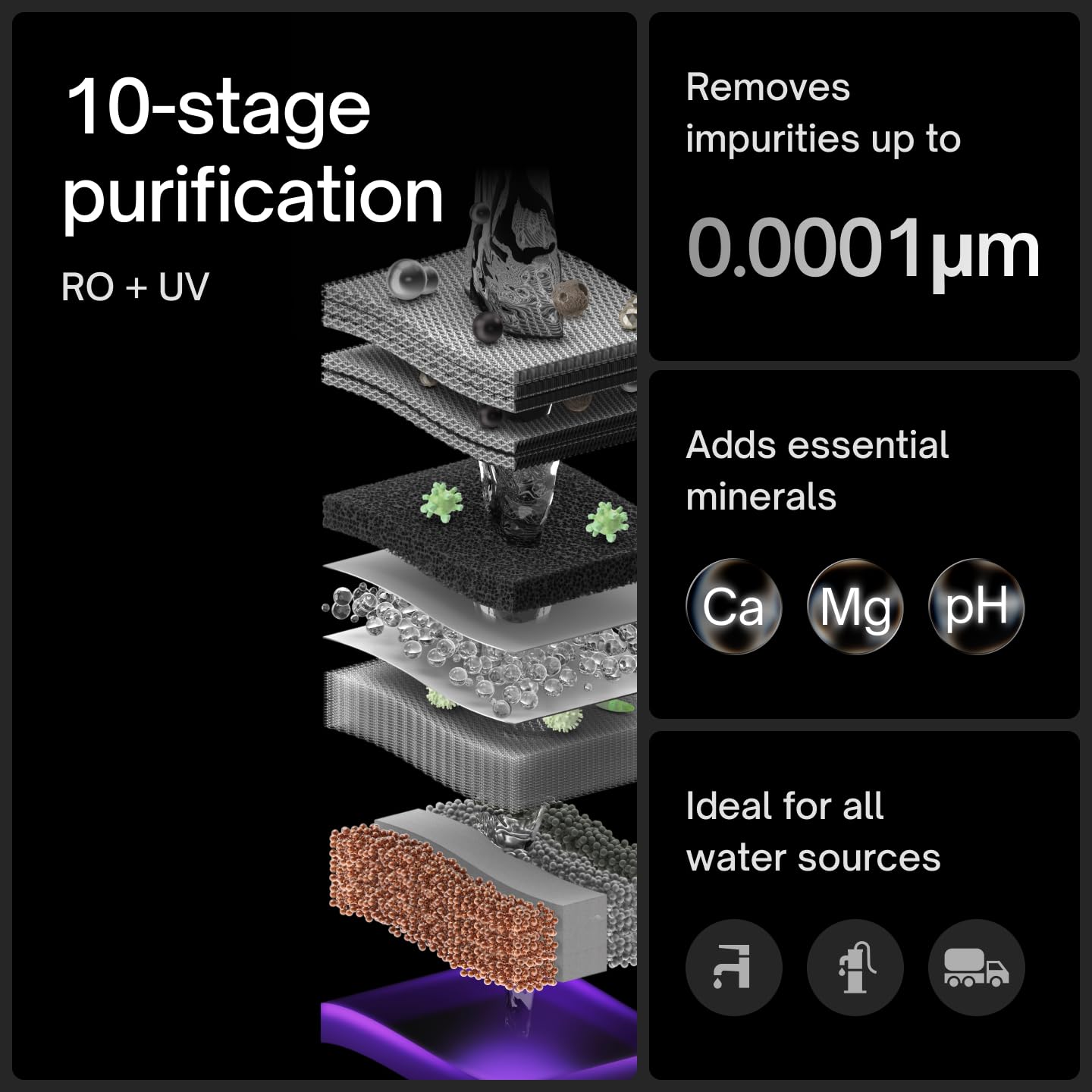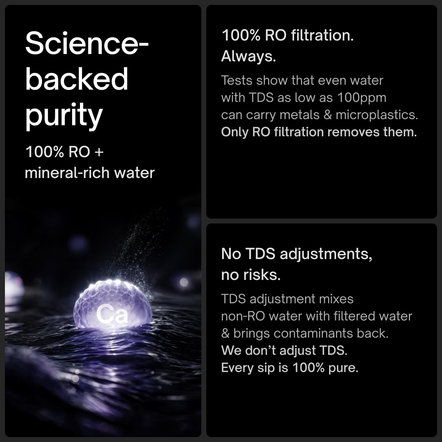 Science-Backed Purity, No Half Measures: Even low TDS water can hide metals and plastics. We eliminate all risks with 100% RO processing, then restore essential minerals. No MTDS mixing, no RO bypassing either.