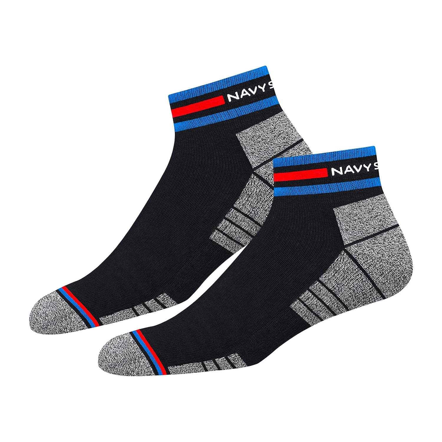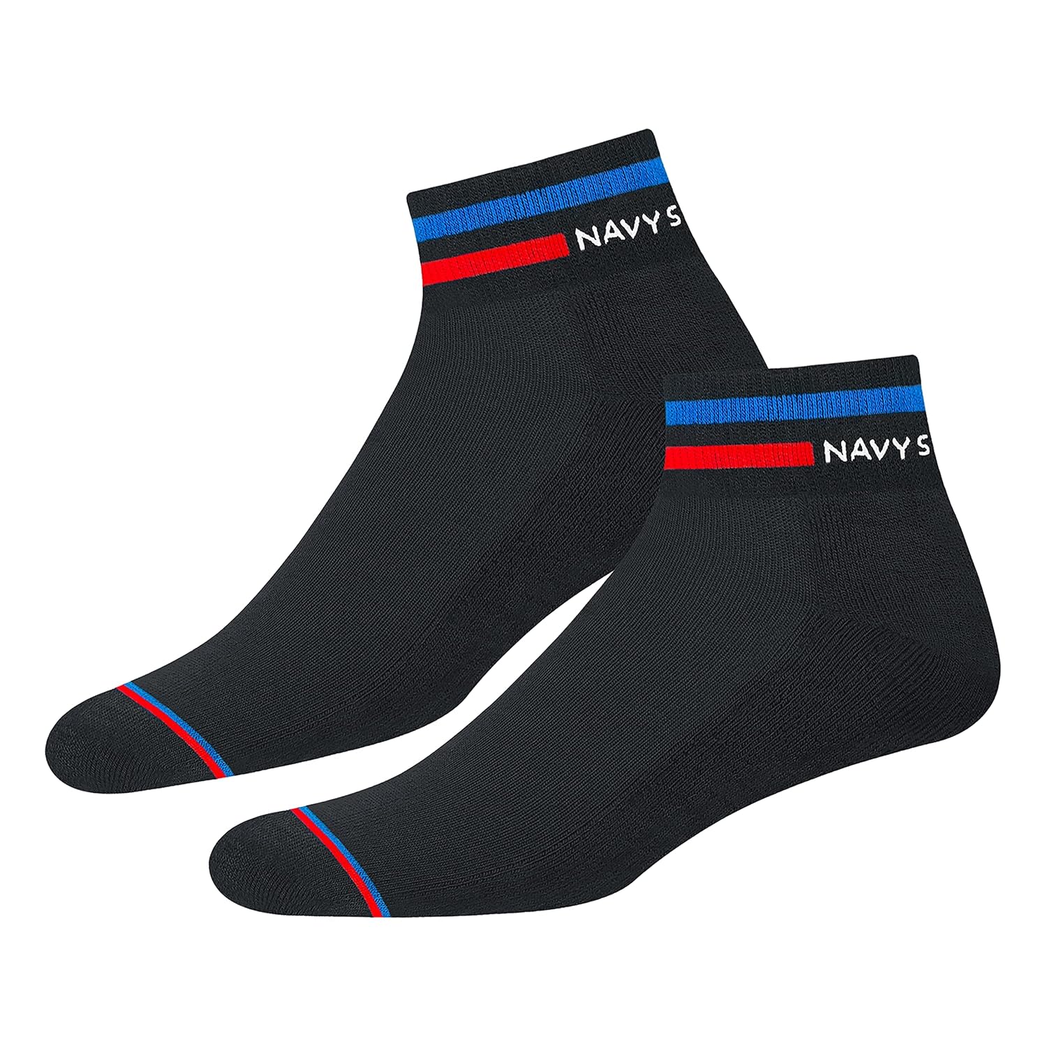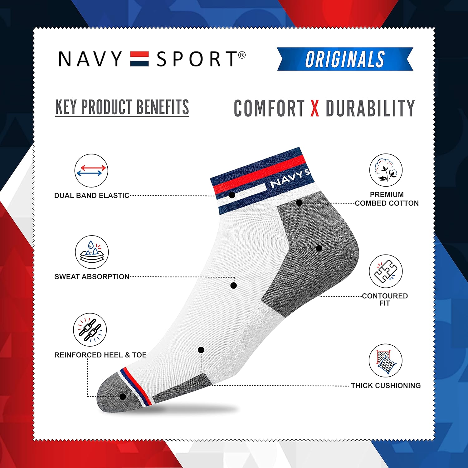NAVYSPORT Originals premium ankle socks incorporate cutting edge design techniques to deliver maximum comfort to your feet. Crafted from the highest grade combed cotton sourced from the best of class spinning mills in India, each pair of socks has a soft cushioned bottom that absorbs sweat and reinforced heel & toe for enhanced durablilty. A durable elastane produced from premium grade rubber is used to ensure a firm grip and withstand everyday wear and tear.