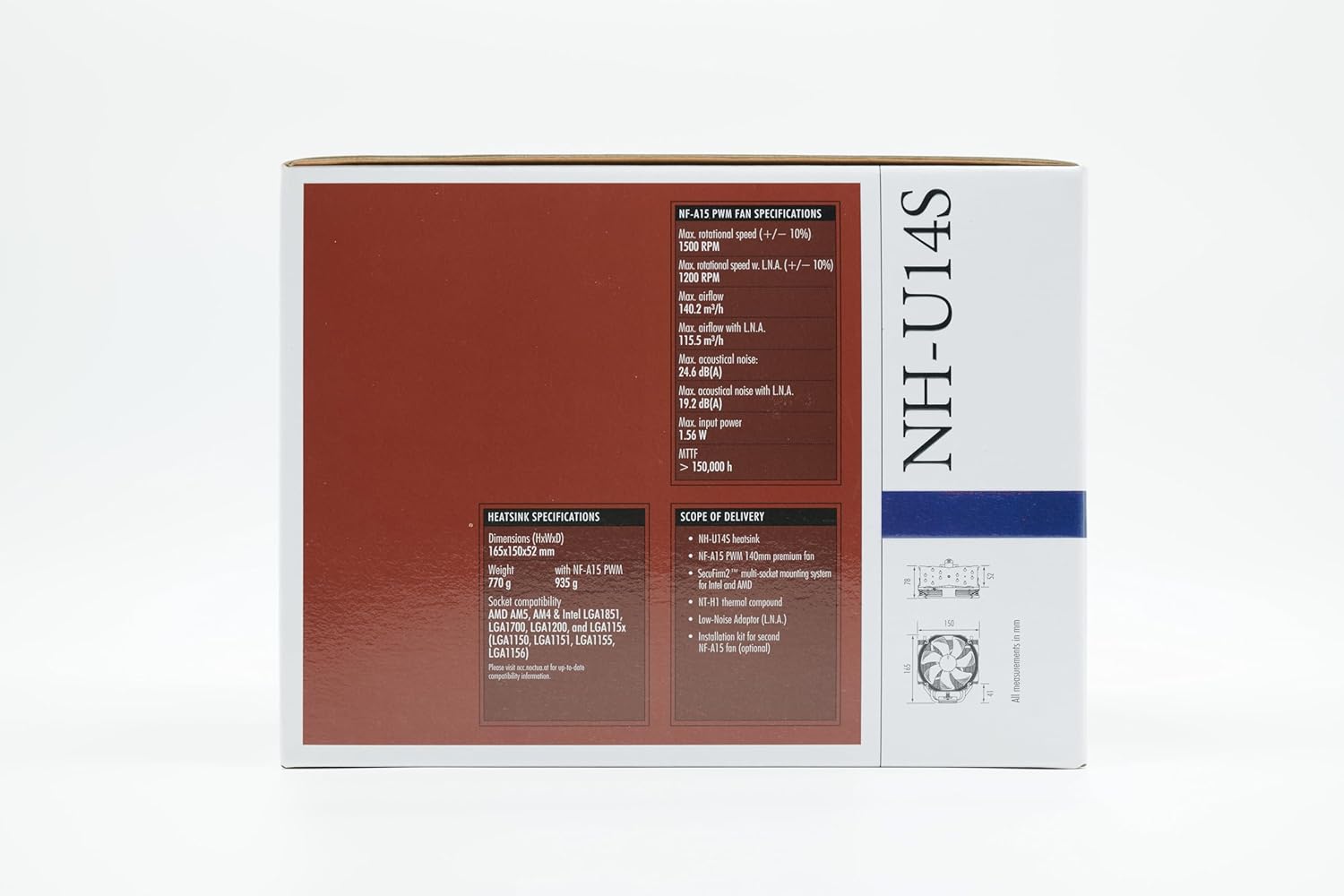 Standing 165mm tall, the NH-U14S is short enough to fit most modern high-end cases. Measuring 150mm wide (including fan and fan clips), the NH-U14S provides better compatibility with SLI and CrossFire setups as compared to tower coolers that are wider than 150mm or use fans wider than 150mm.